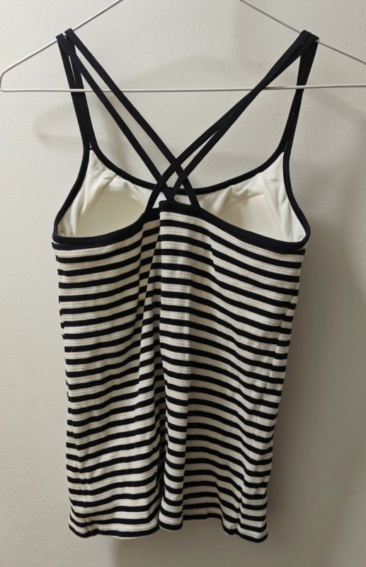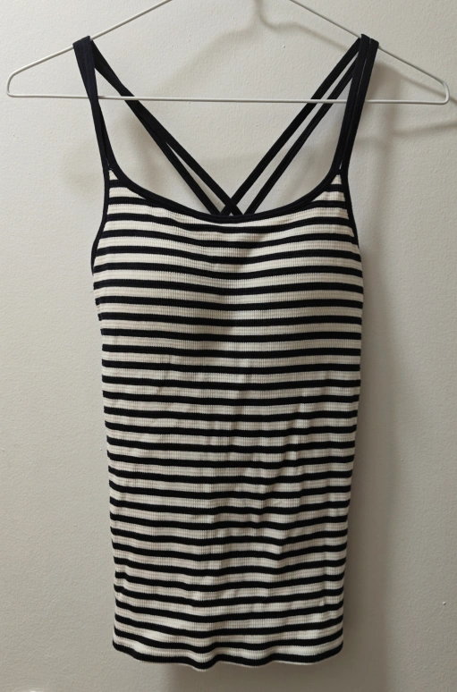 Navy and white striped cami top. Built-in bra for support. Cross-back straps. Comfortable ribbed fabric. Great for layering or wearing on its own. Worn once but it's not my size.