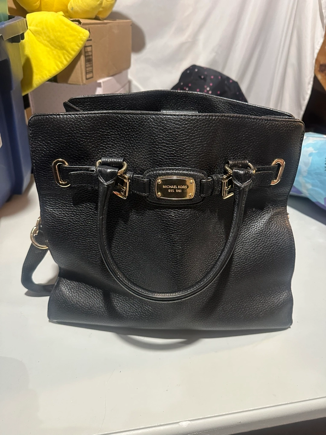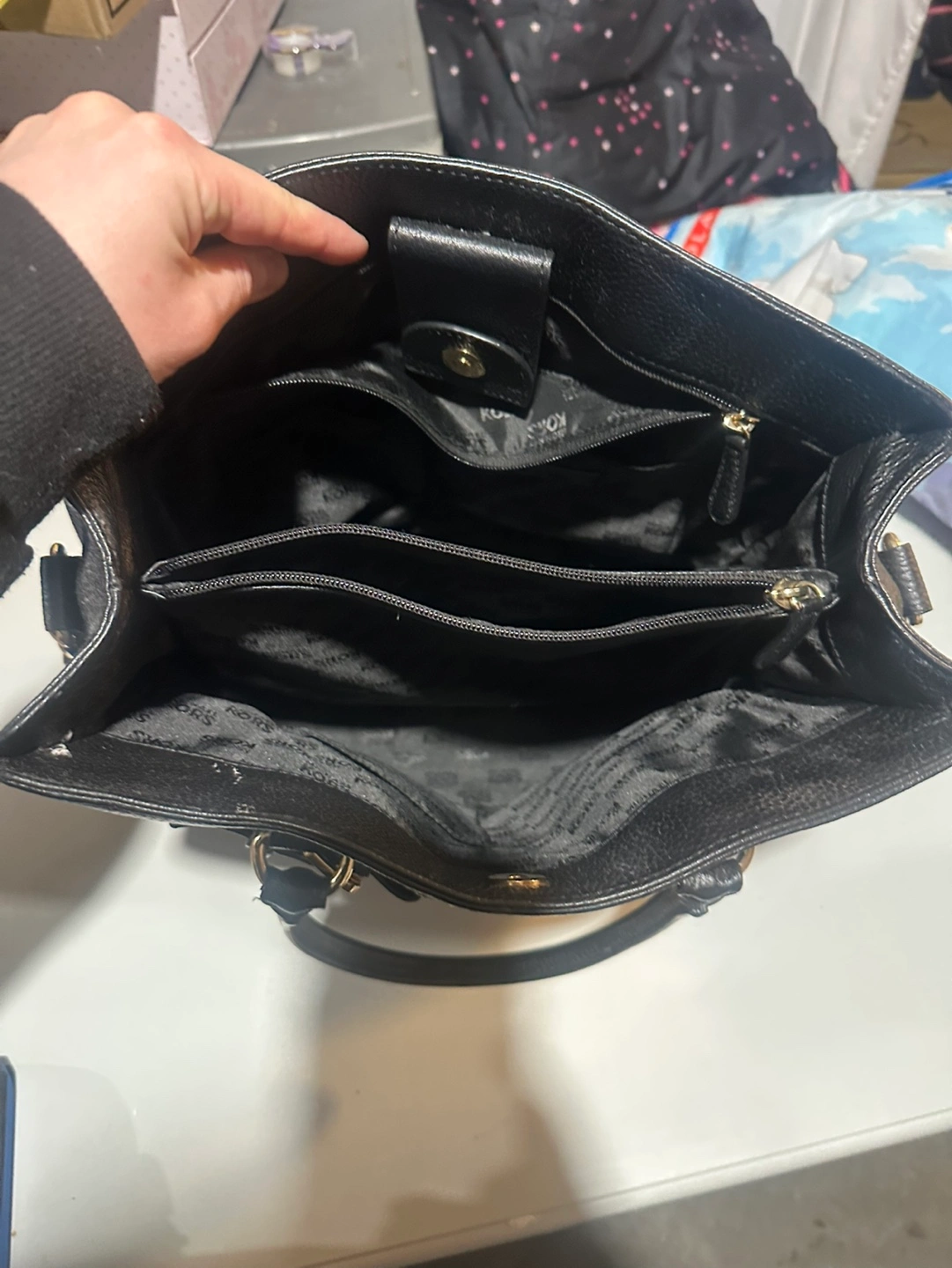 Black leather handbag. Gold hardware. Multiple interior compartments. Shoulder strap. Pre-owned.