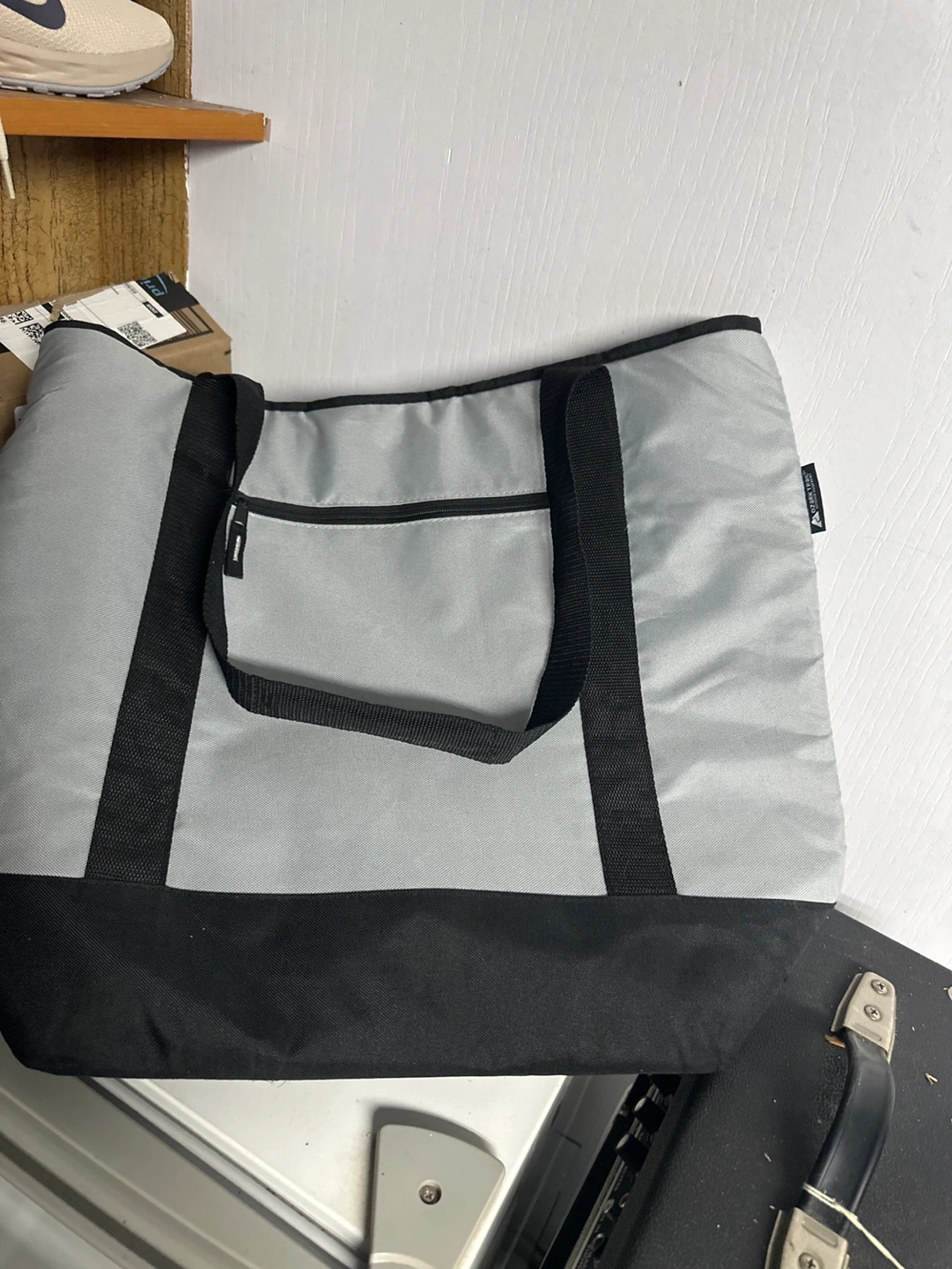 Large tote bag. Grey top with black bottom. Two shoulder straps. Small zippered pocket on the front. Insulated.