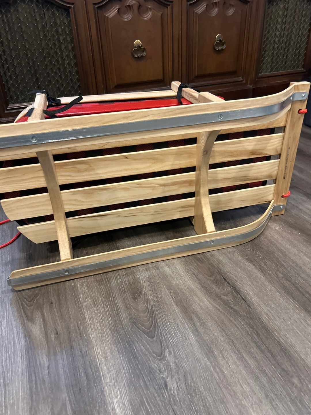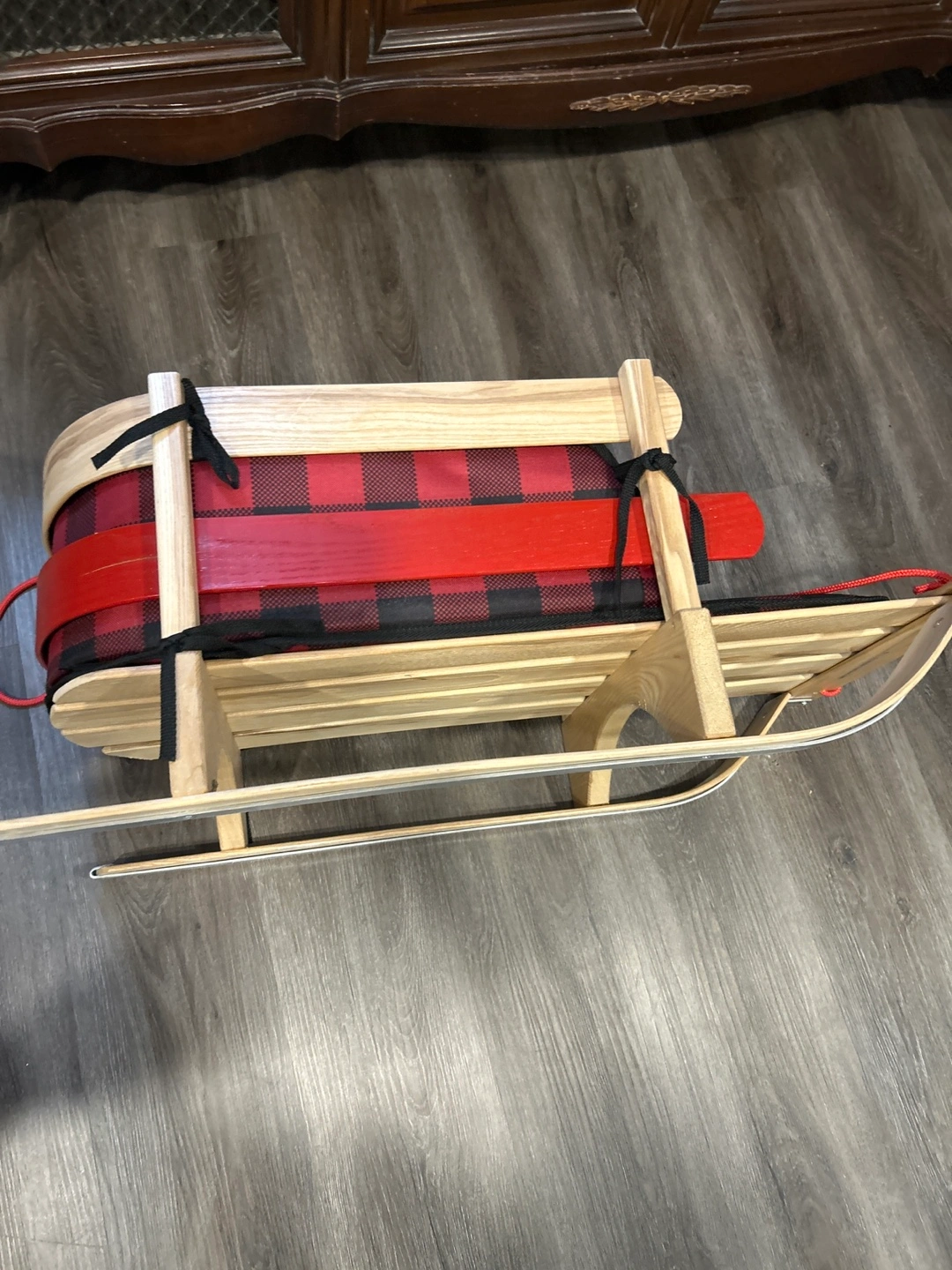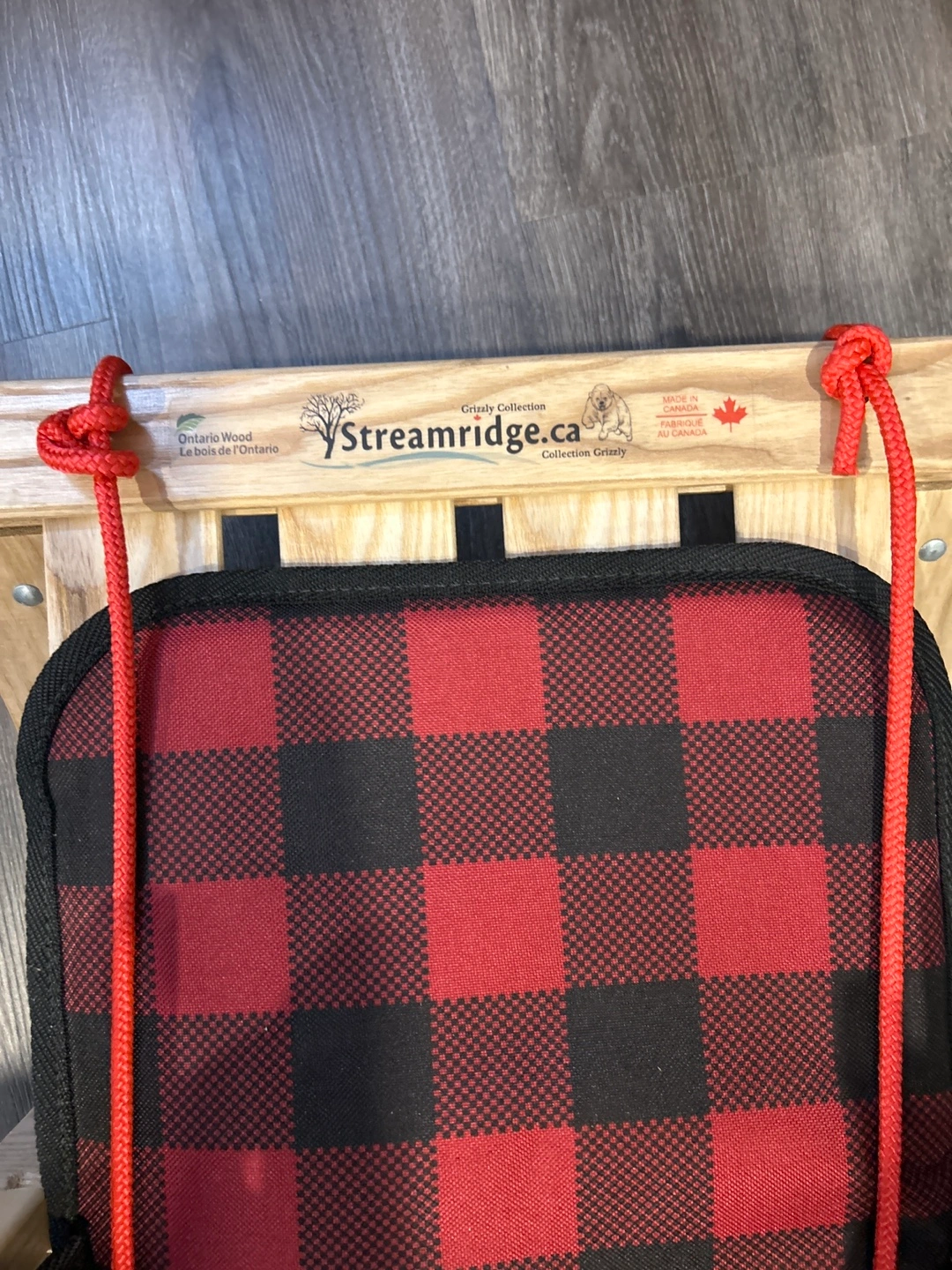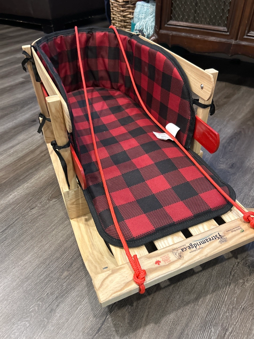 Adorable wooden sled. Red and black buffalo check padded seat. Made in Canada. Perfect for winter fun!