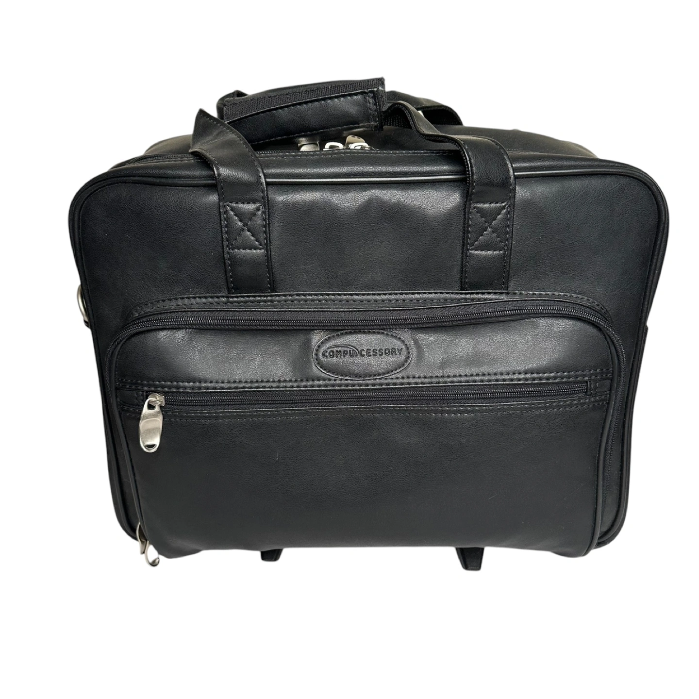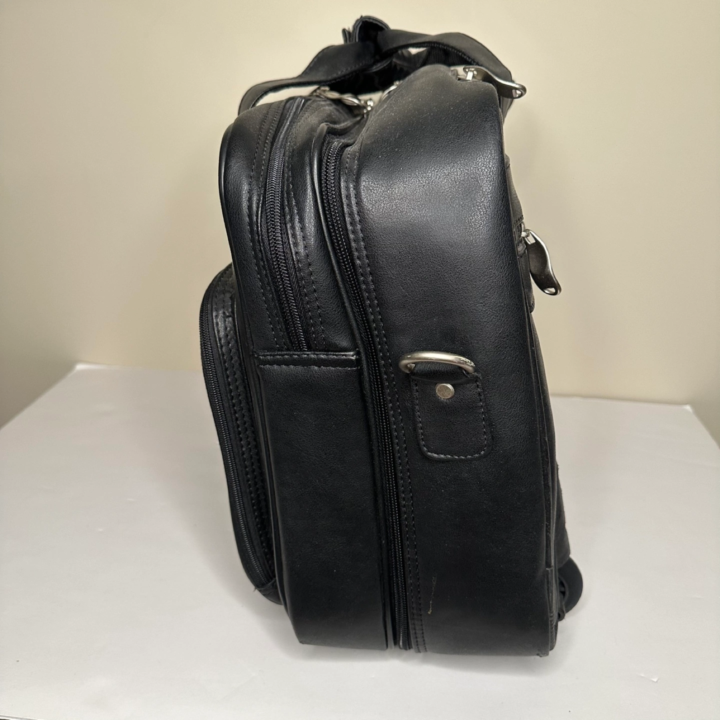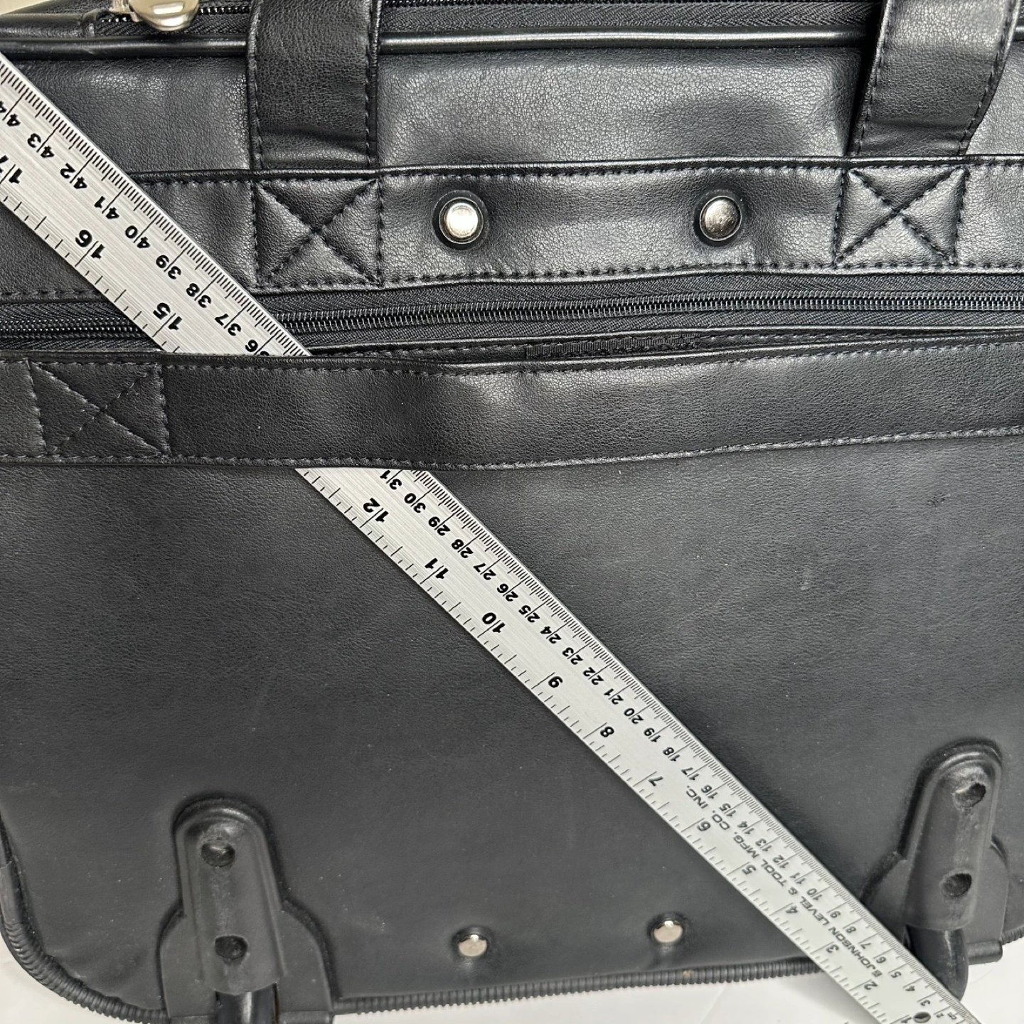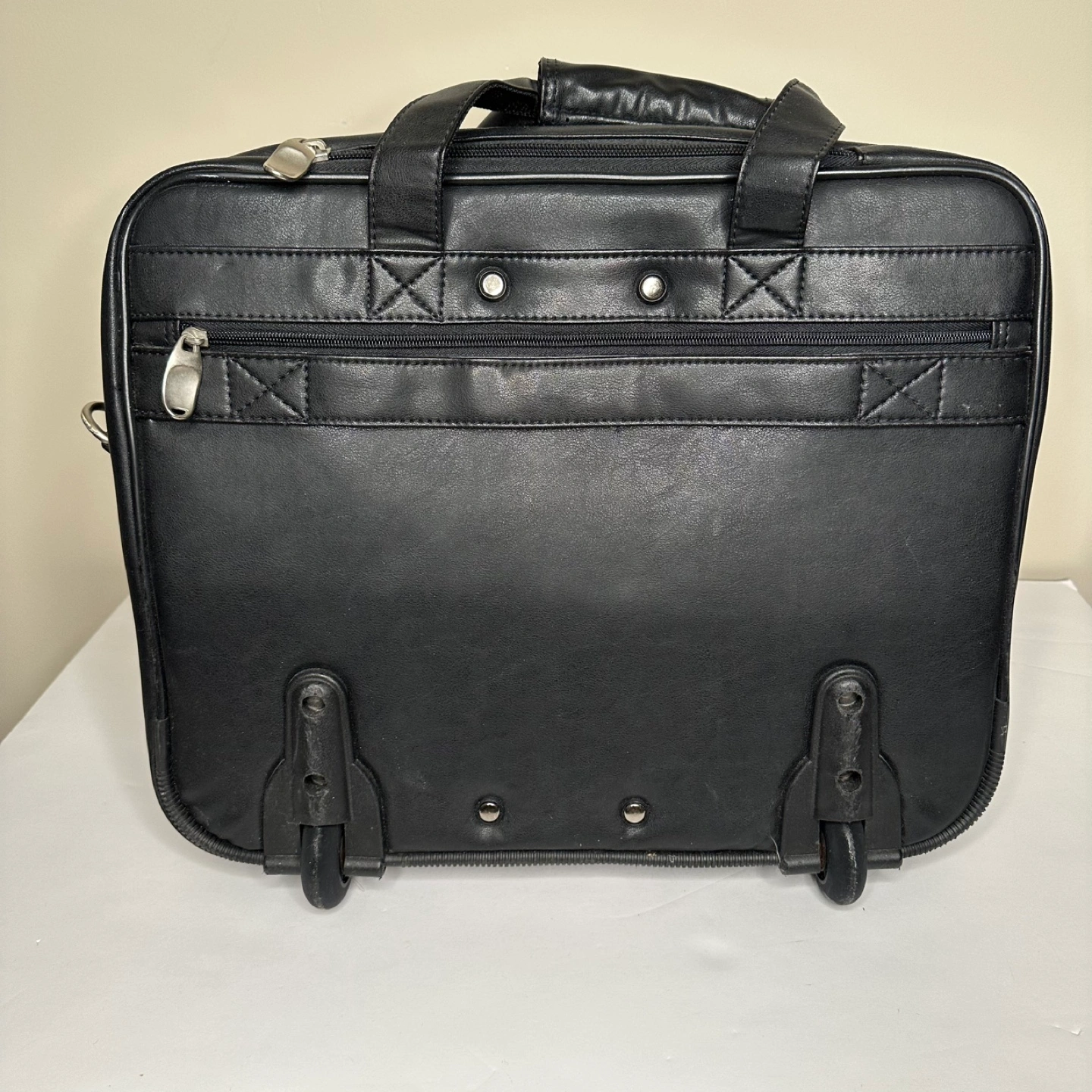 Black briefcase bag with many zipped pockets, two compartments, two wheels and extendable handle. Dimensions Height - 13” or 33 cm Width - 16 1/2” or 42 cm Depth - 7” or 18 cm Note: Shoulder Strap is NOT Included