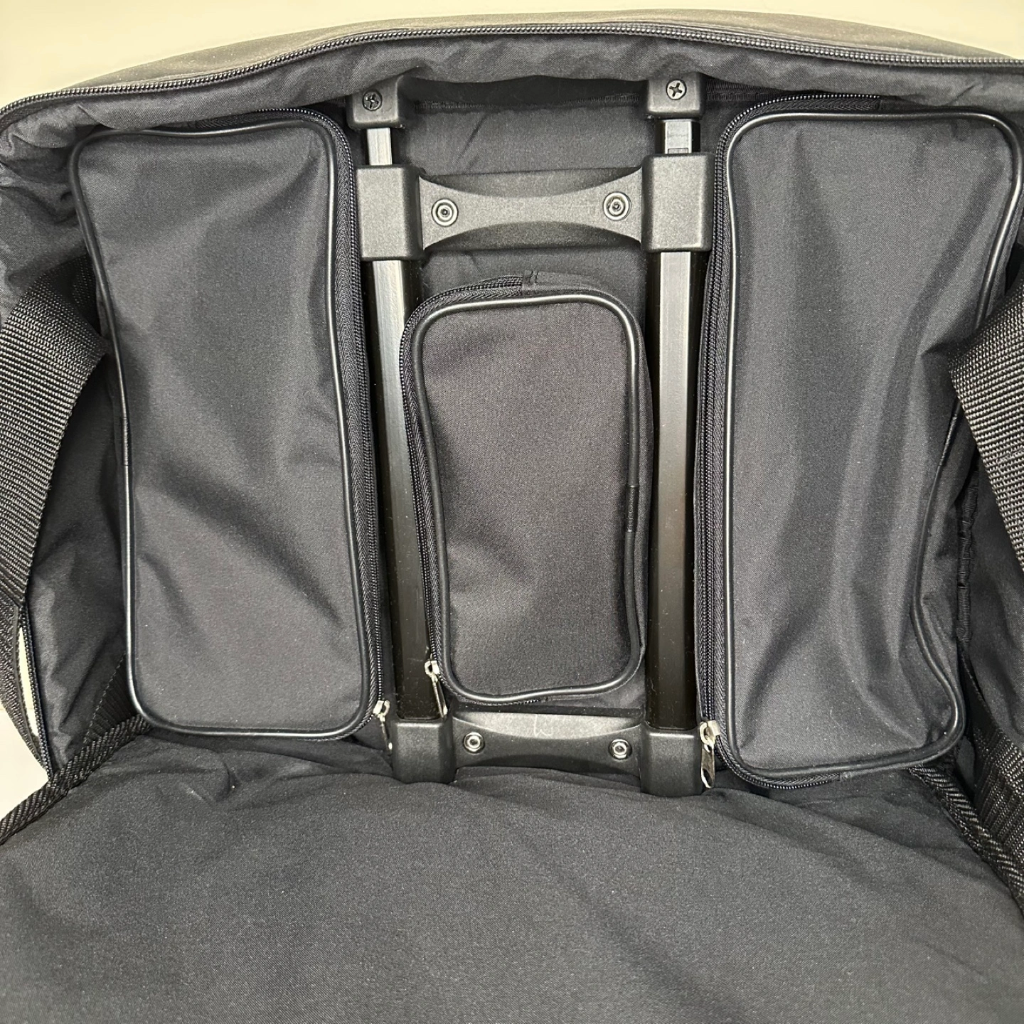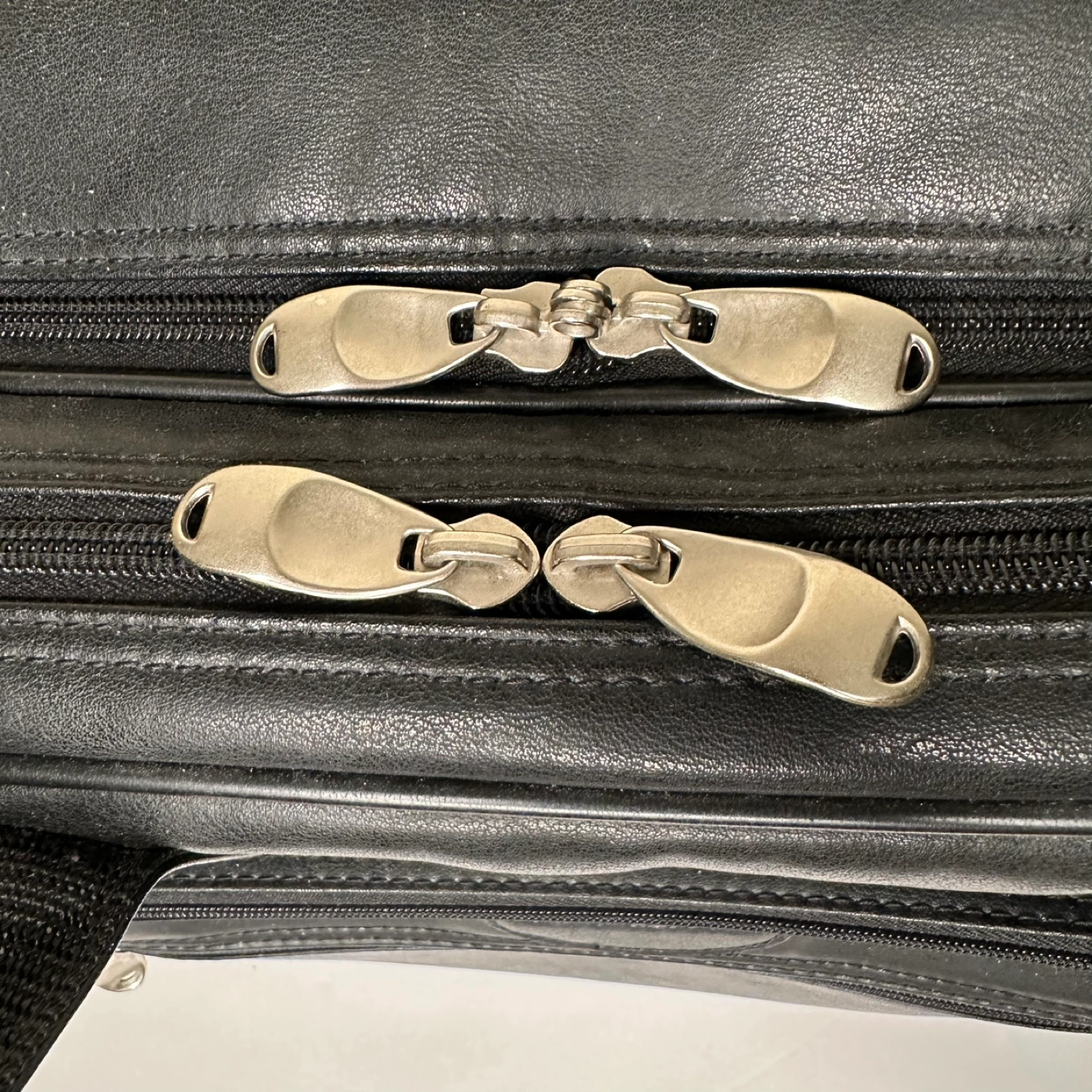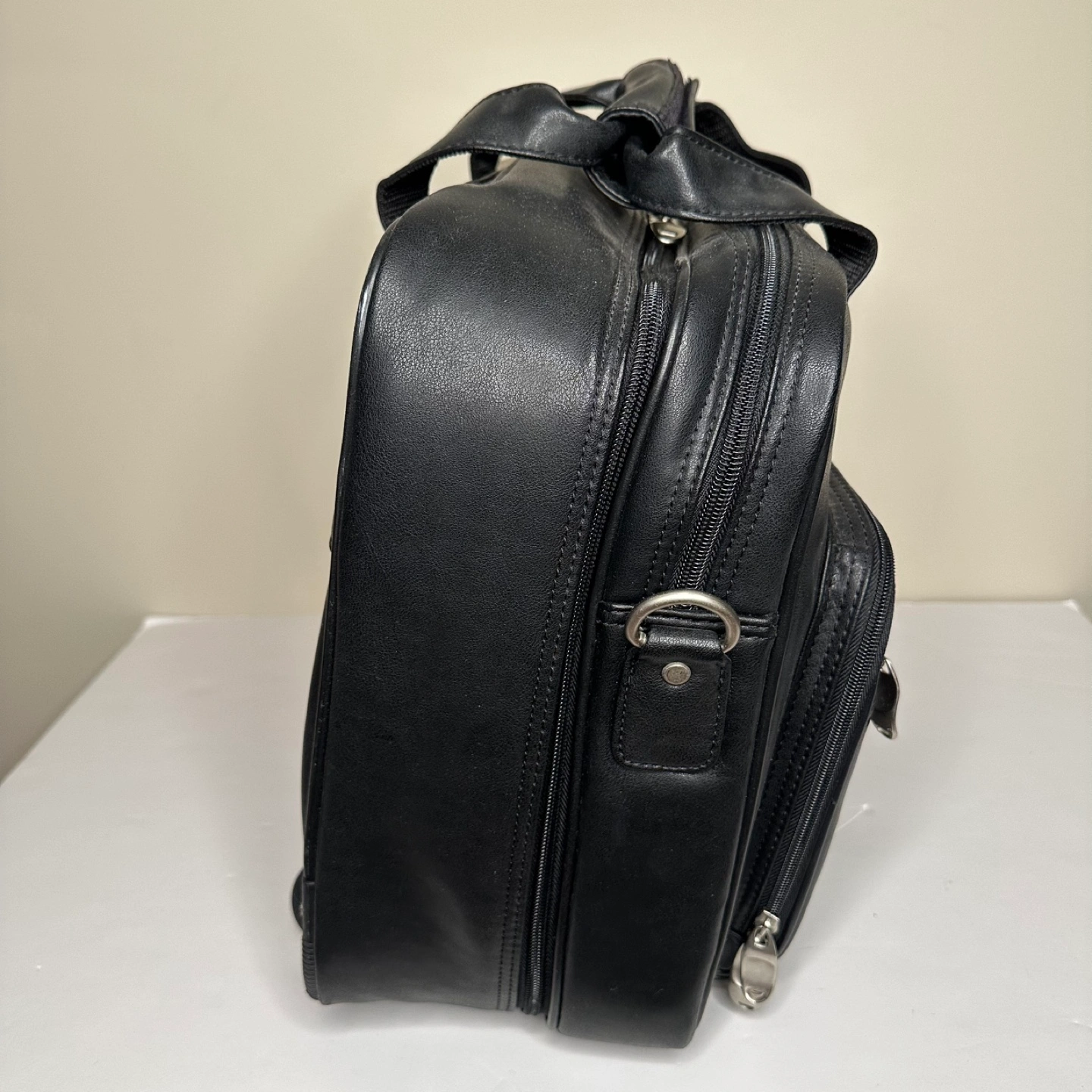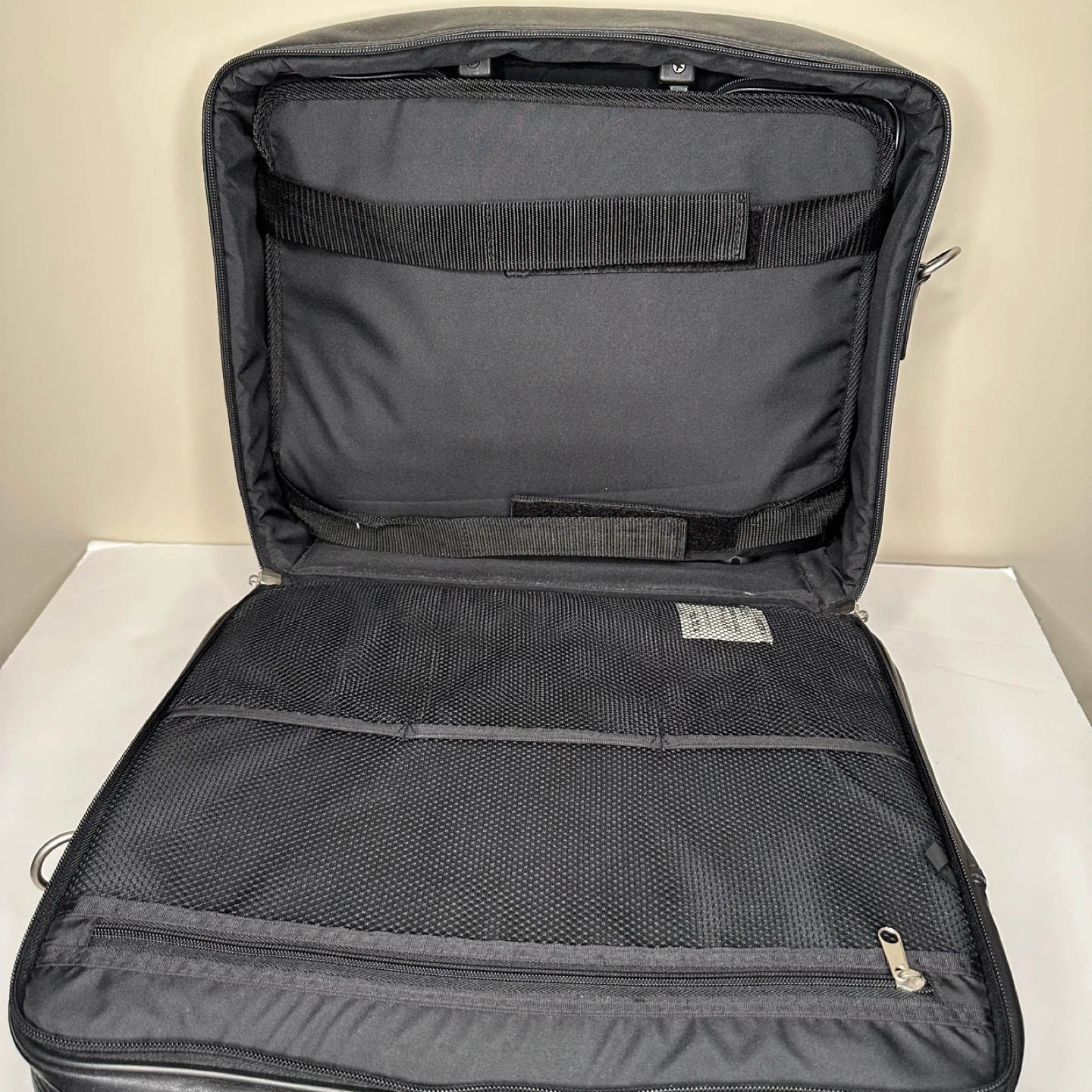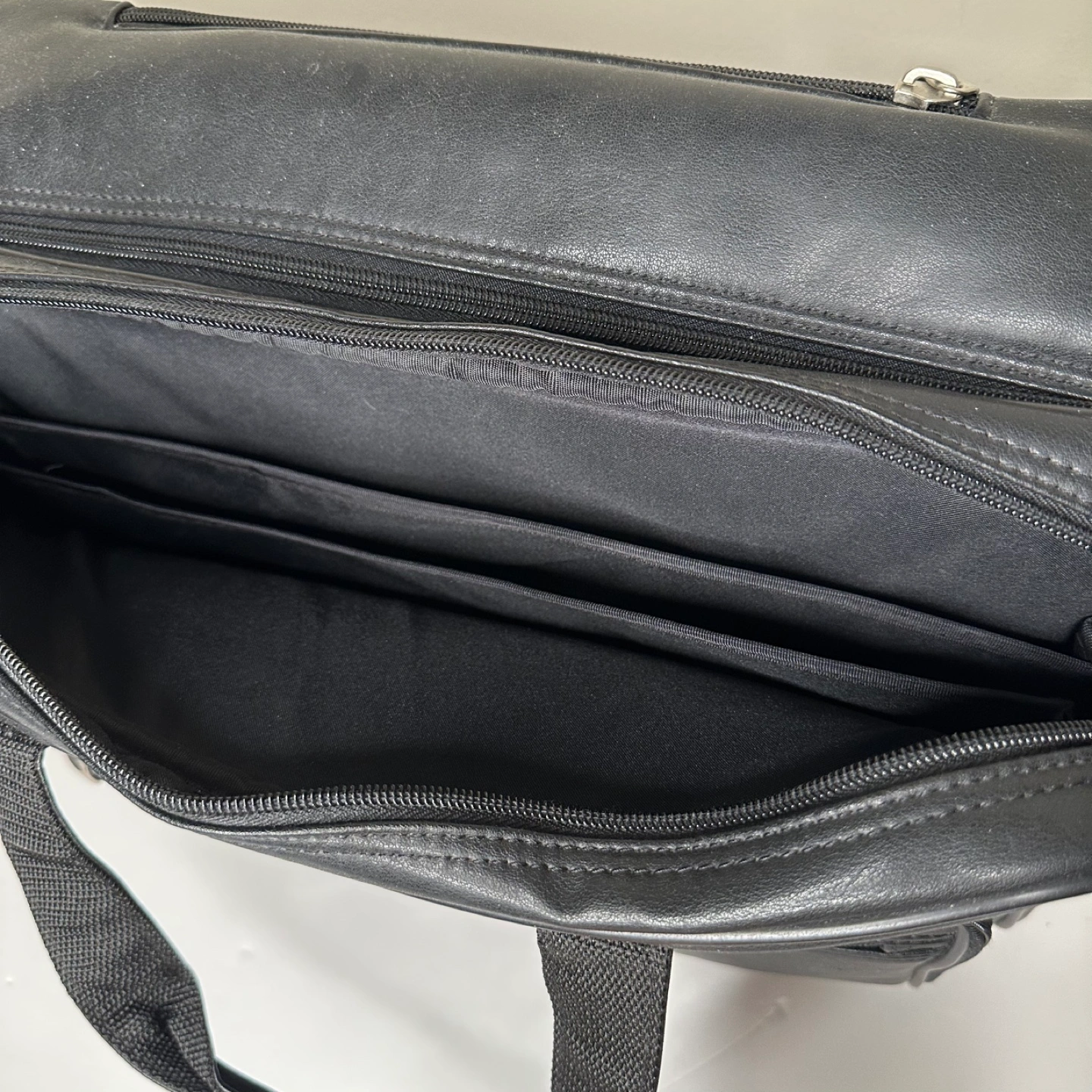 Black briefcase bag with many zipped pockets, two compartments, two wheels and extendable handle. Dimensions Height - 13” or 33 cm Width - 16 1/2” or 42 cm Depth - 7” or 18 cm Note: Shoulder Strap is NOT Included