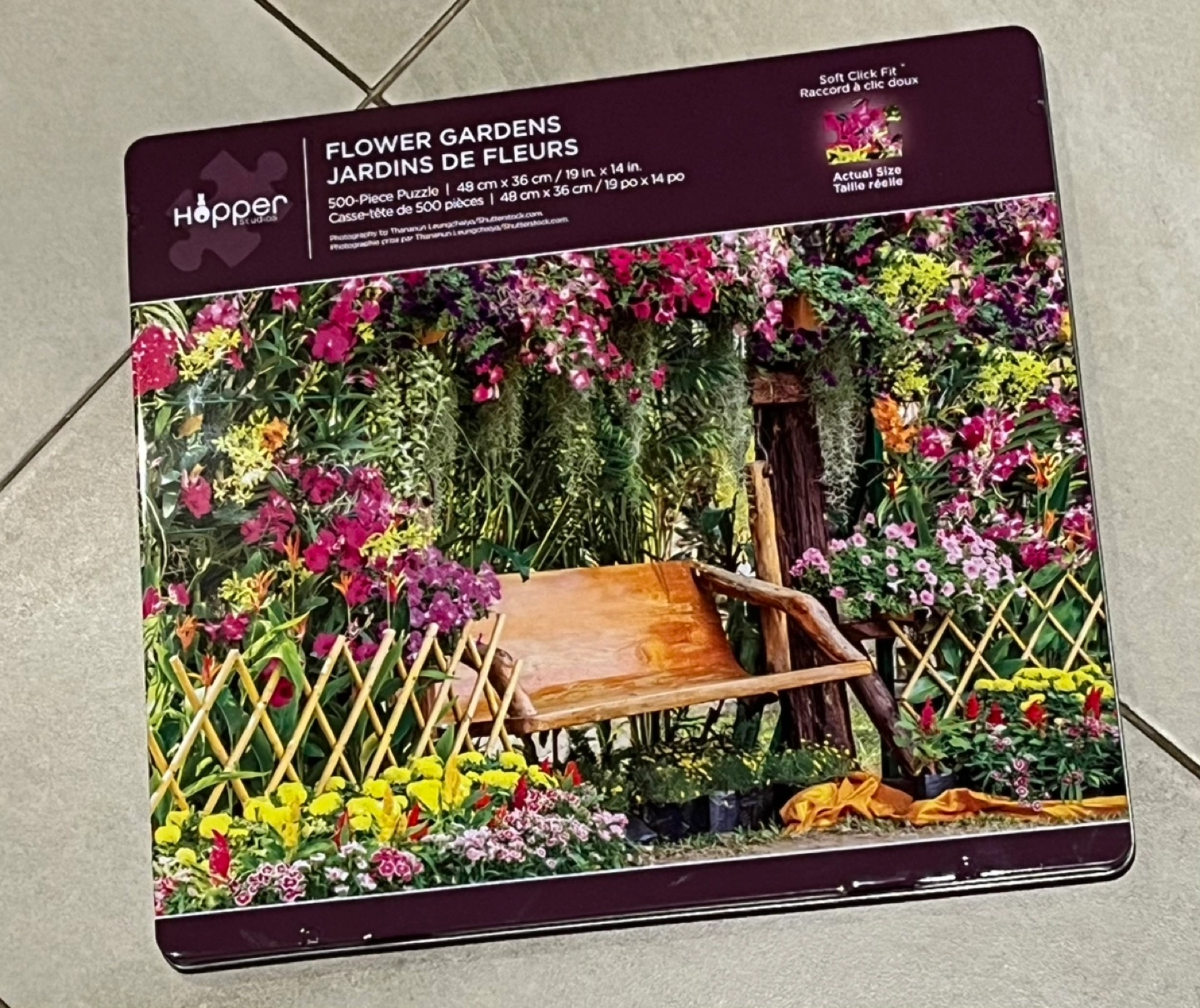 500-piece jigsaw puzzle. Flower Gardens theme. Comes in a purple metal tin. Unopened. Giftable!