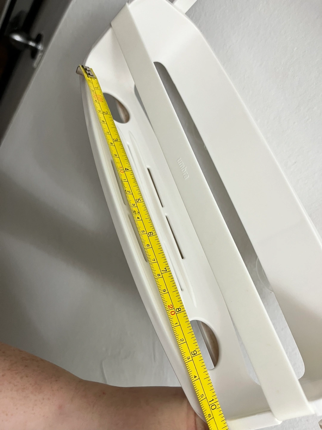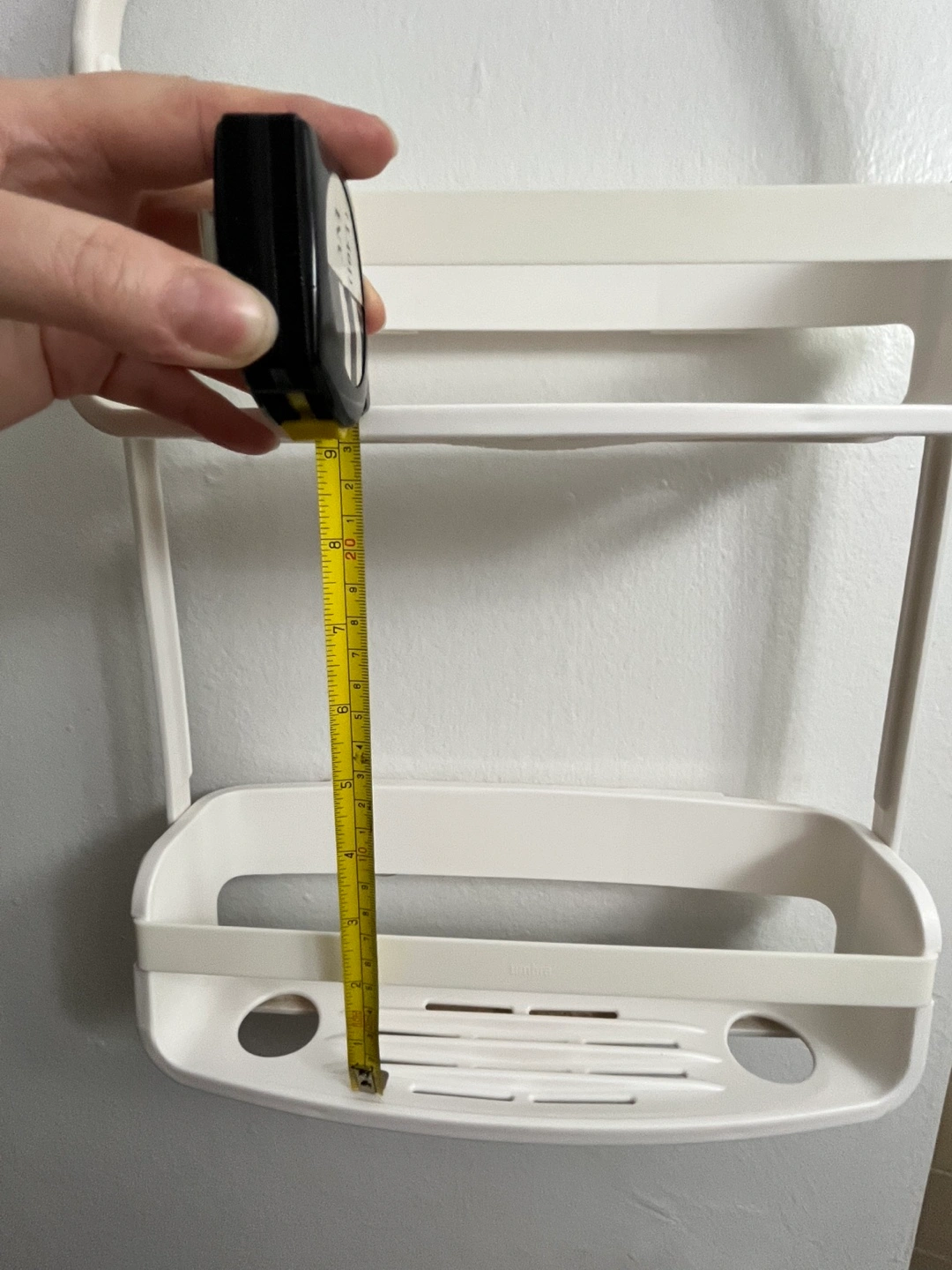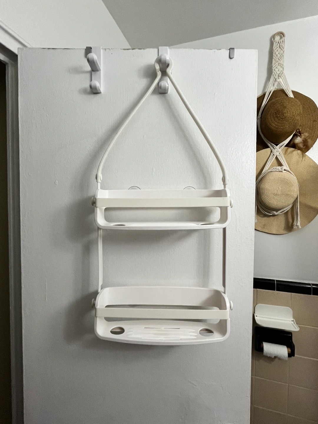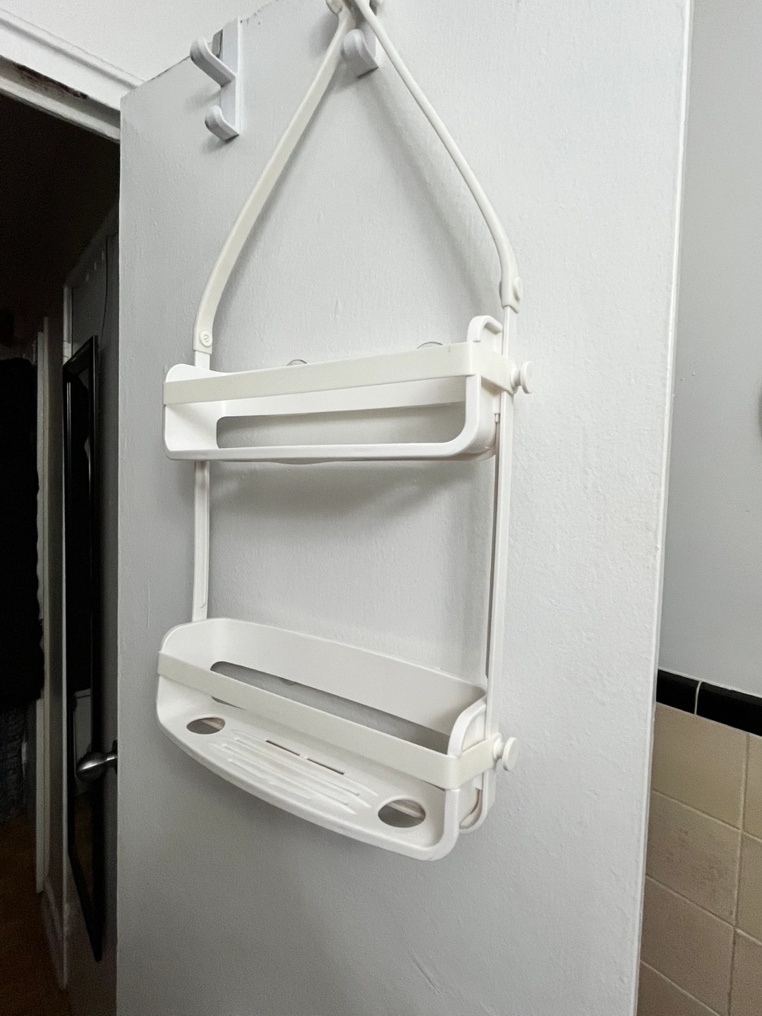 White plastic shower caddy with two shelves. Lightly used and cleaned well. Less than a year old. Hangs over the shower head, suction cups at the back to stabilize. Bottom shelf is good for bottles less than 9in tall. Shelves are 10in long and roughly 3in deep but can accommodate thicker bottles, the rubber strap across the shelves can stretch. LOCATION: For pickup at my home near King St West and Jameson Avenue in Parkdale. Exact address is only given for confirmed pickups.