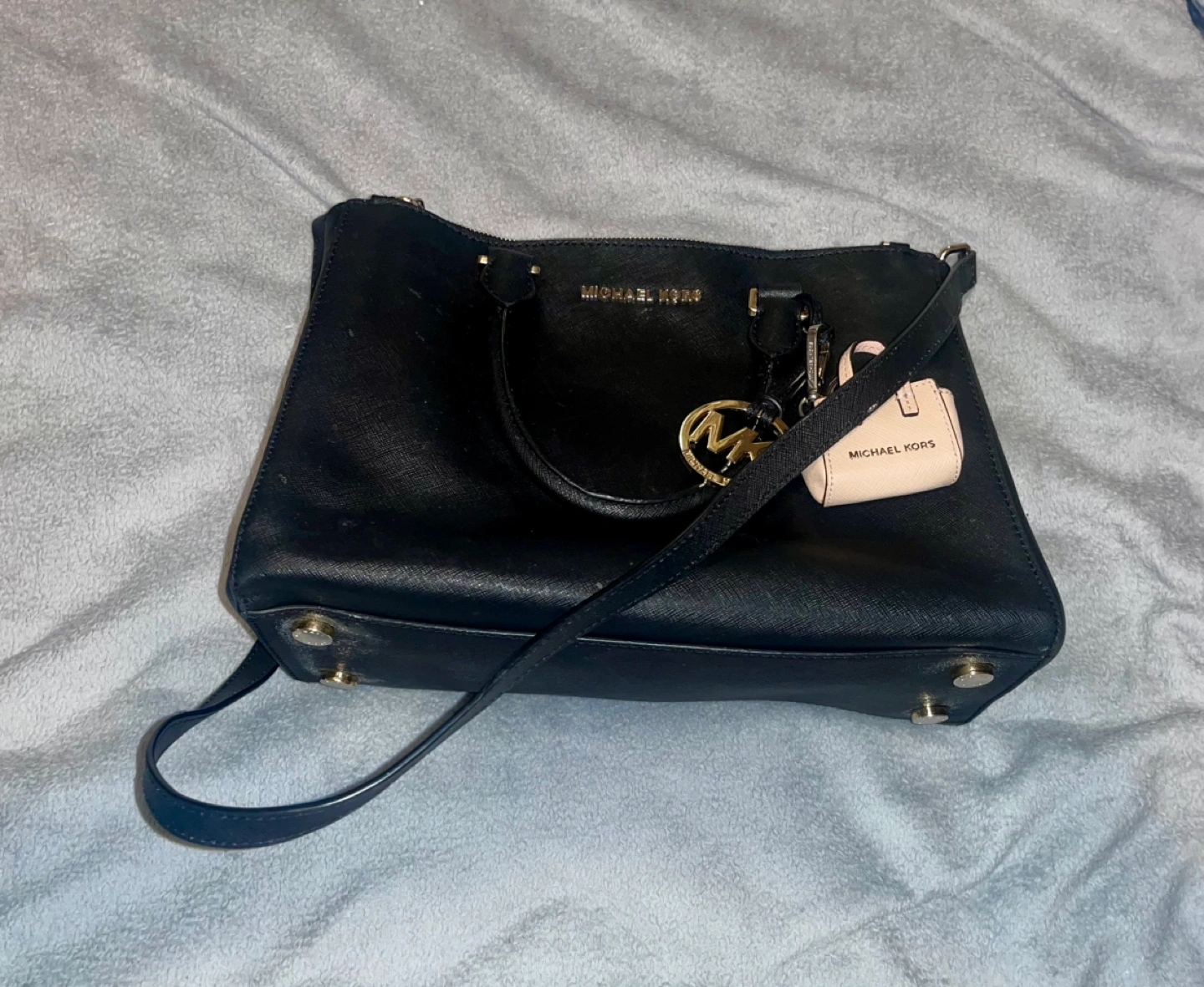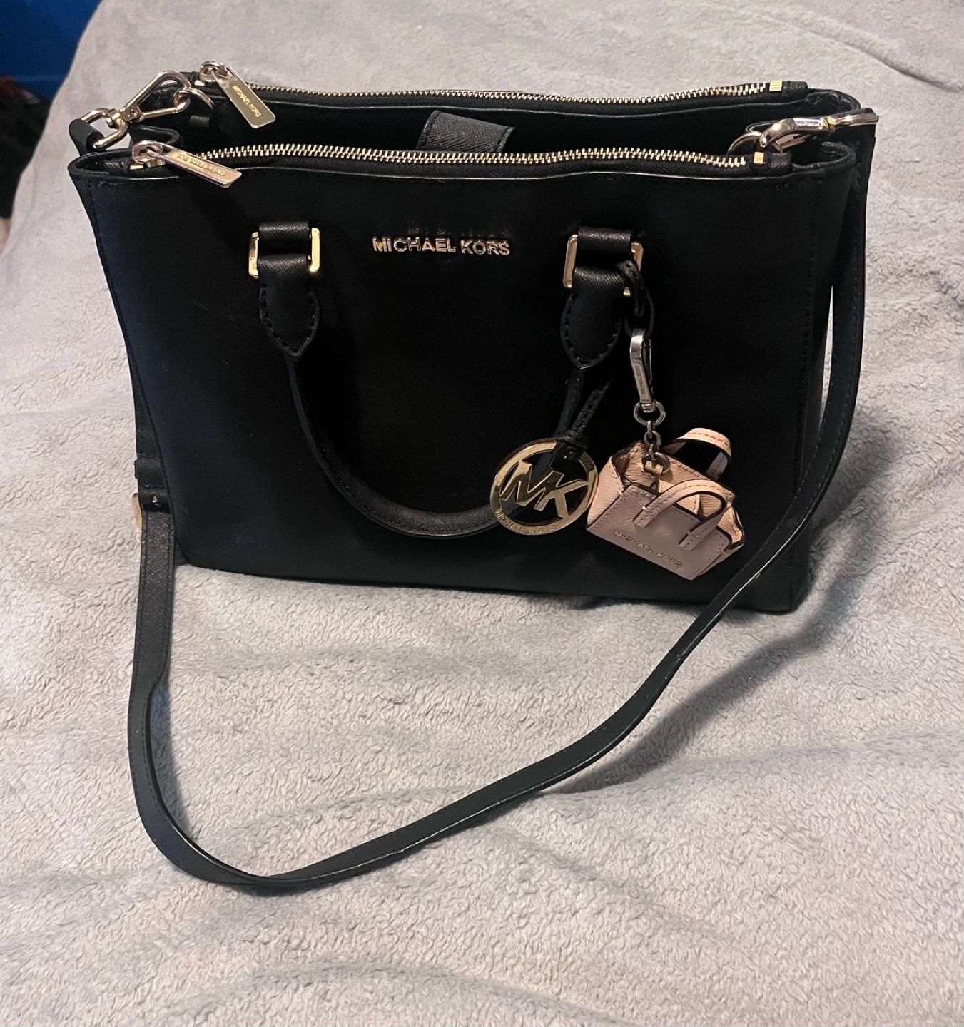 Black leather satchel handbag. Double zipper closure. Top handles and detachable shoulder strap. Includes Michael Kors charm. Excellent for everyday use.