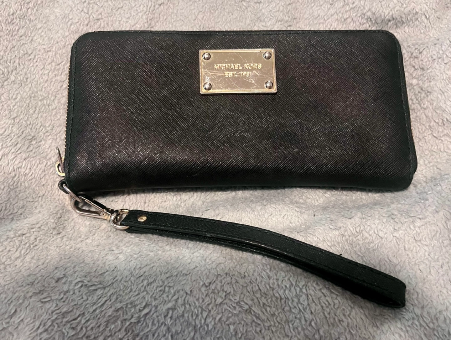 Black leather zip-around wallet. Features a wrist strap and gold-toned hardware. Excellent for everyday use.