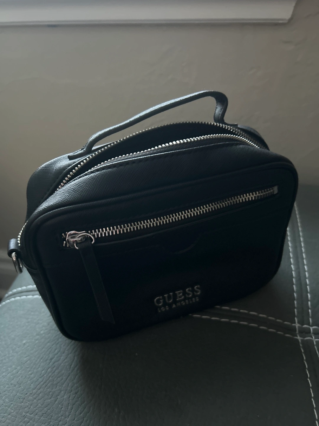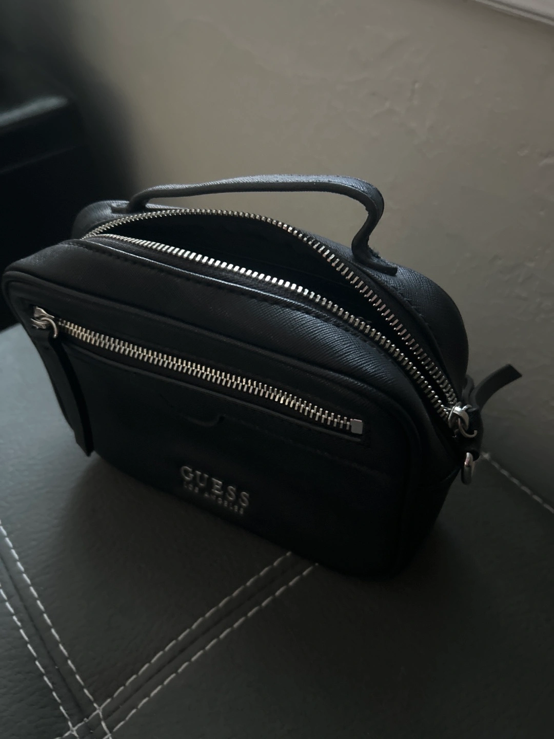 Small black crossbody bag. Features a top handle and silver zippers. Great for everyday use.