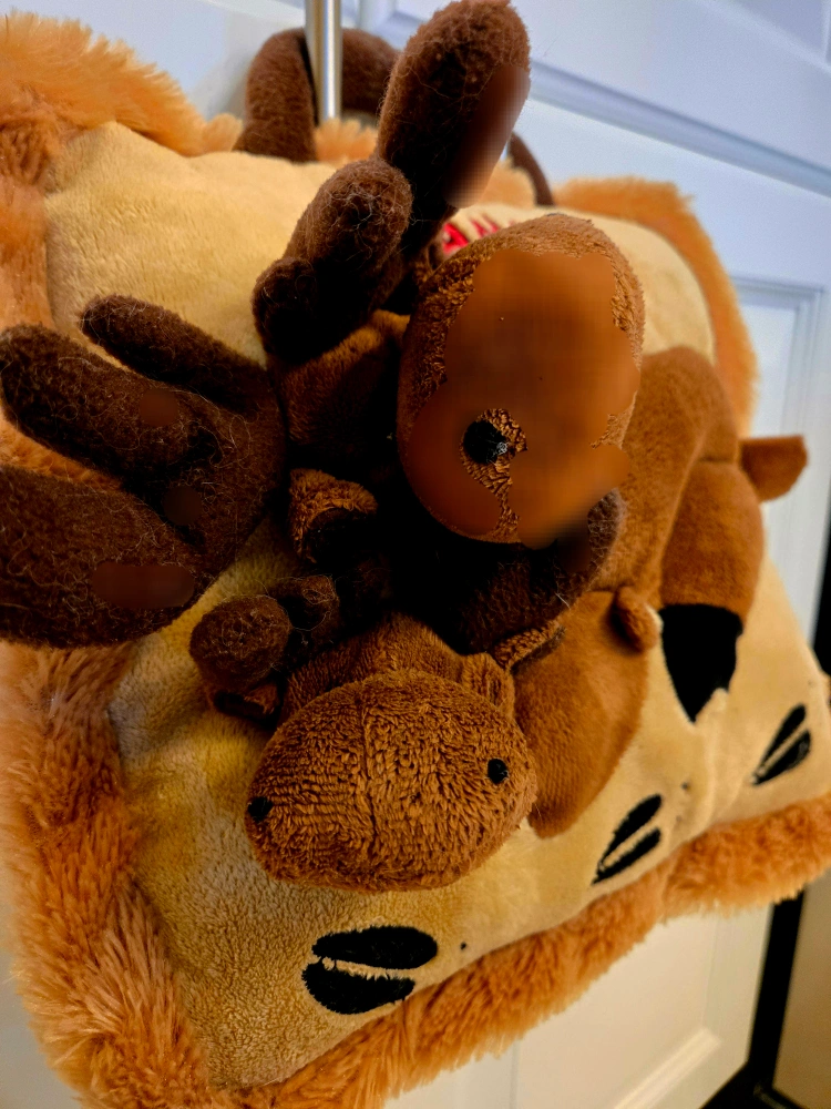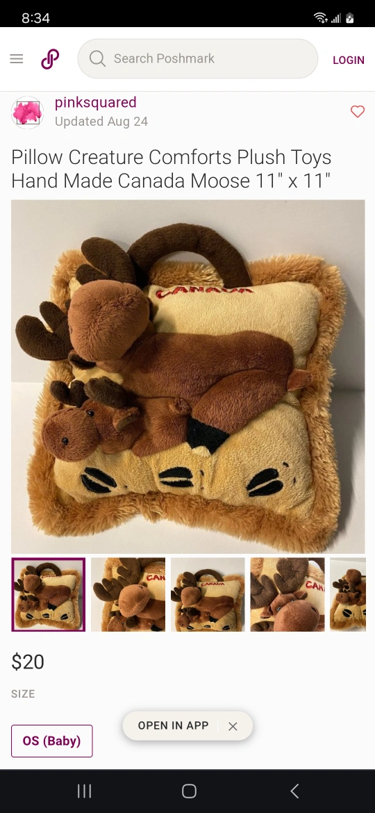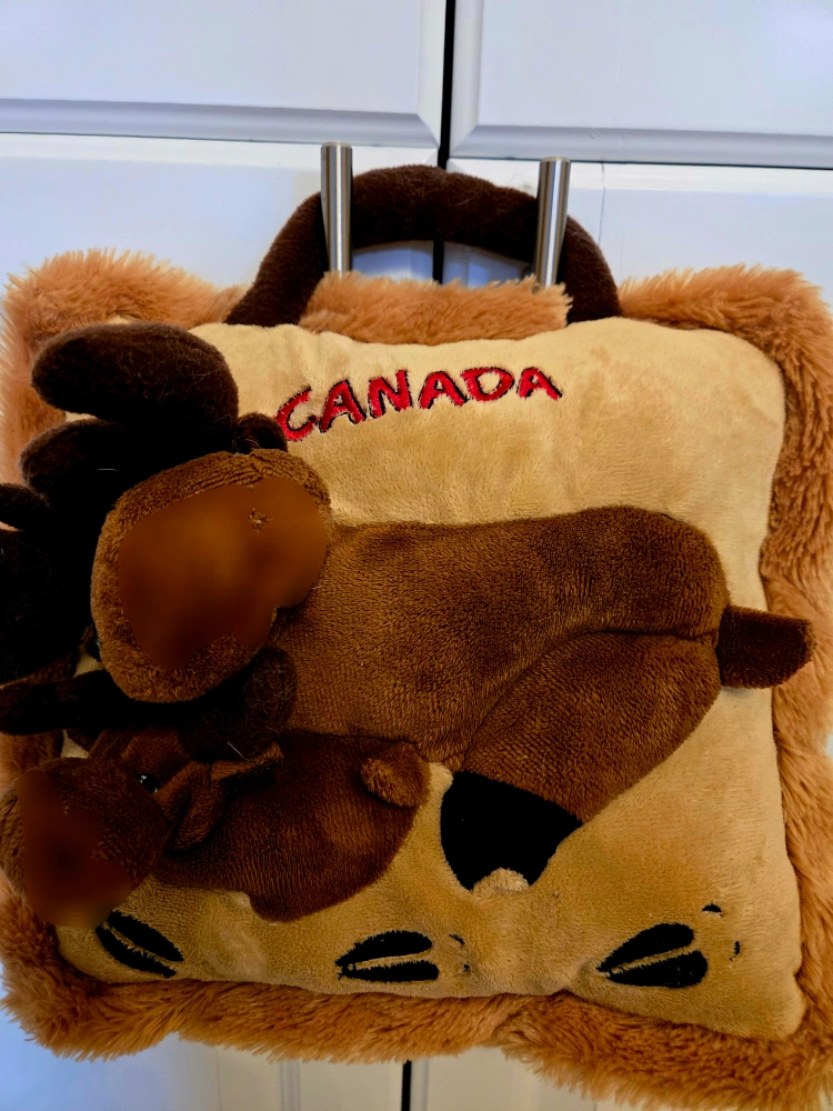 Adorable plush moose pillow. Features two moose plus a Canada logo. Great for kids. Measures 11" x 11".