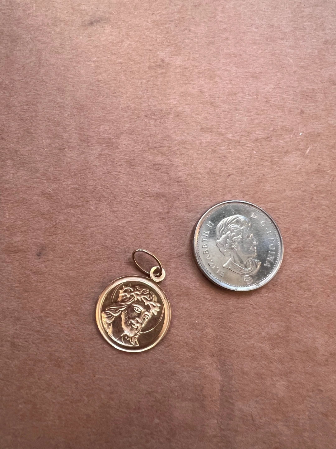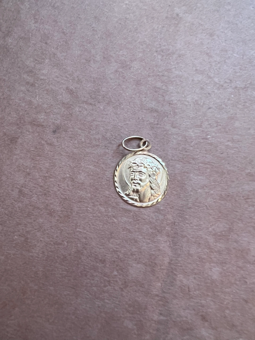 Small gold-toned oval pendant. Features an image of Jesus wearing a crown of thorns. Simple design. Great for layering or wearing alone.