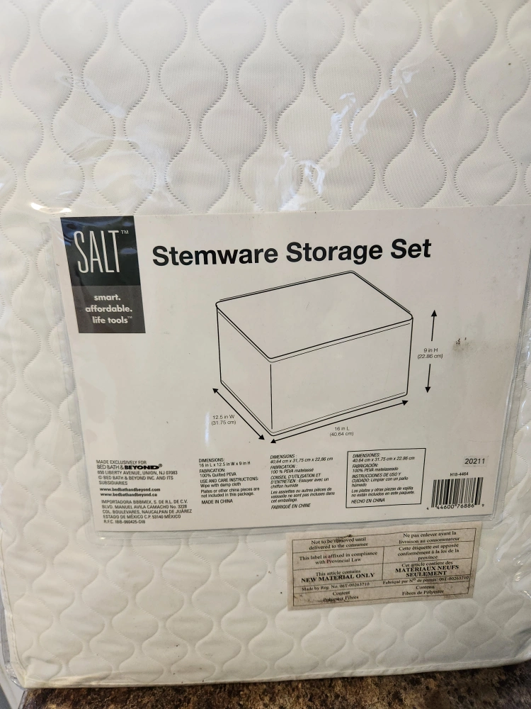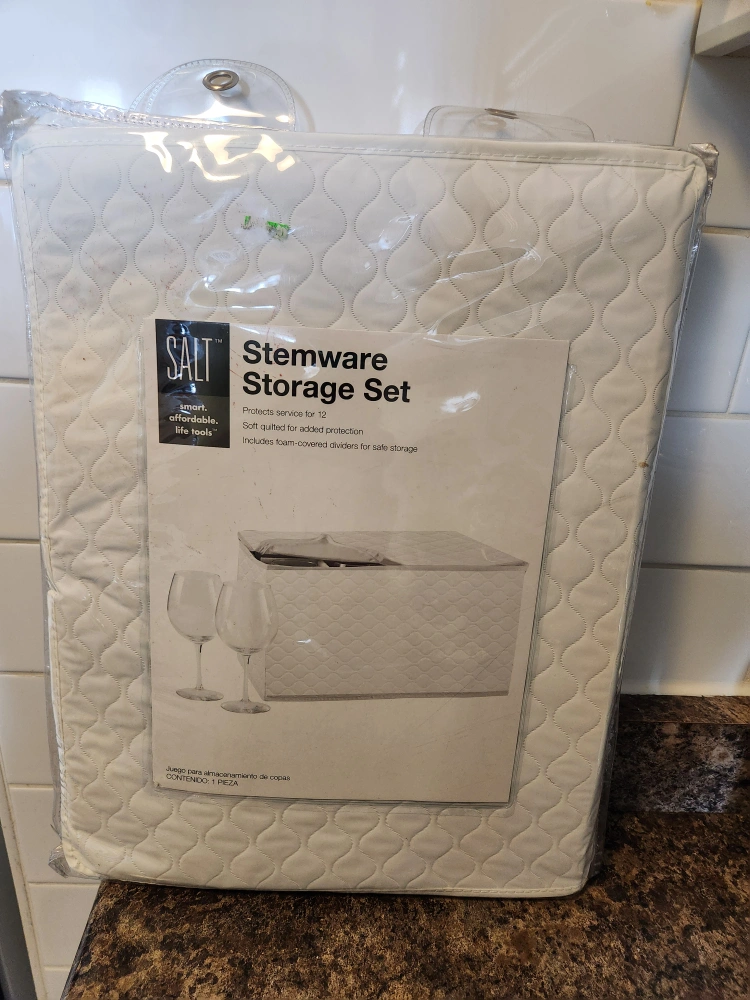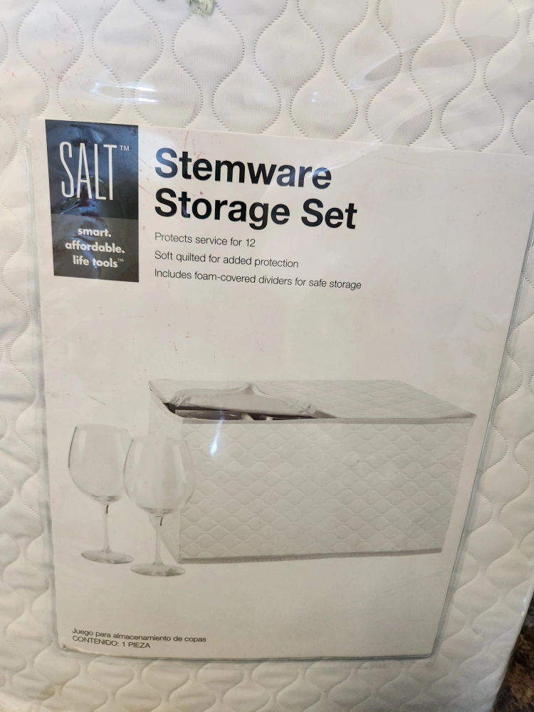 New stemware storage set. Soft quilted material. Foam-covered dividers. Protects service for 12.