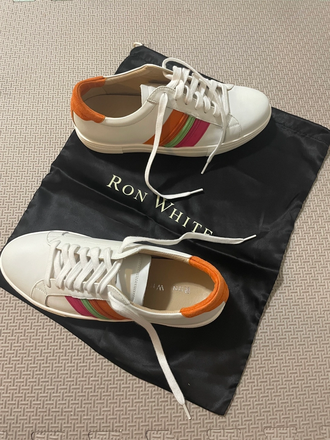 Unworn size 36 White leather sneakers with orange and multicoloured stripes. Come with a dust bag but no box. Low-top style.