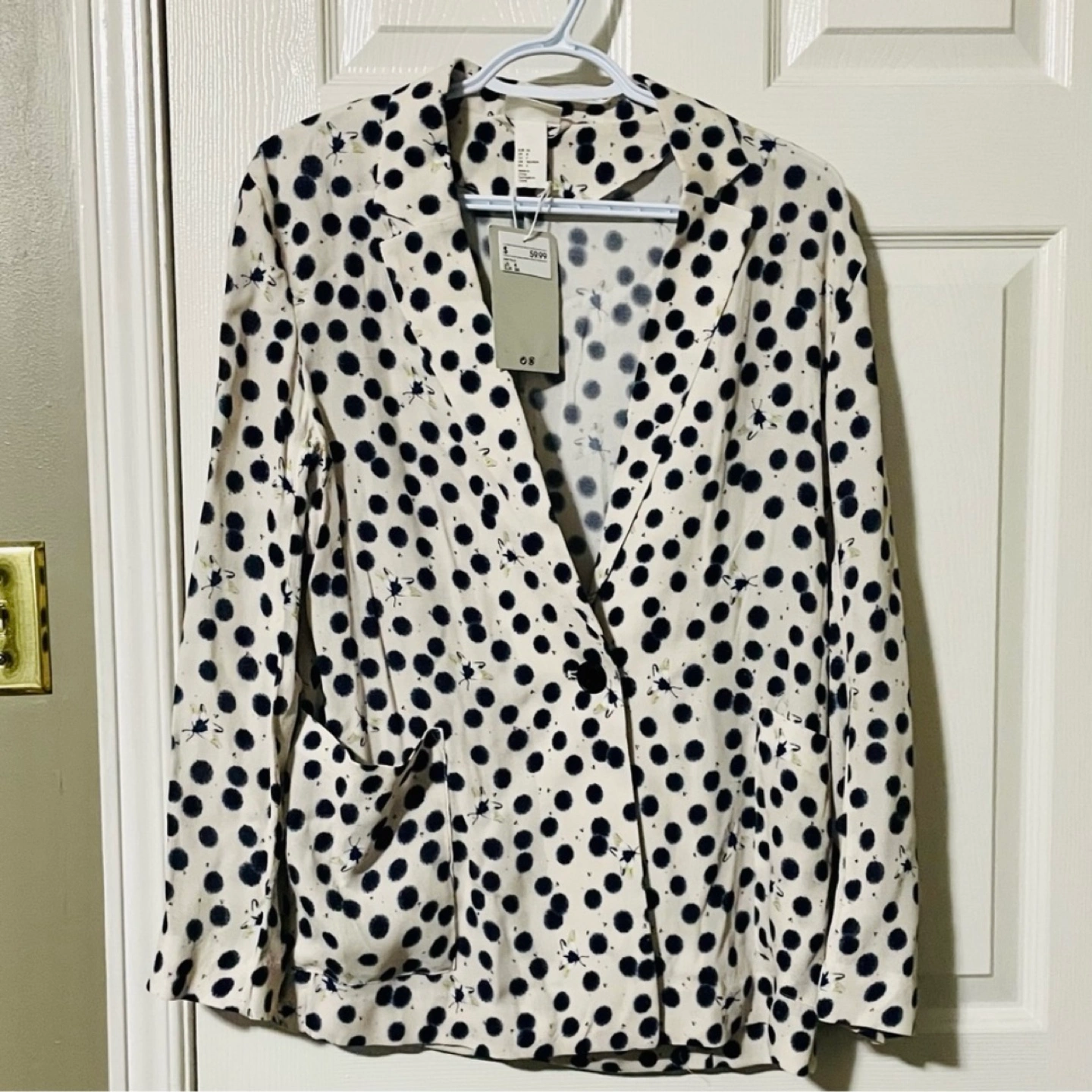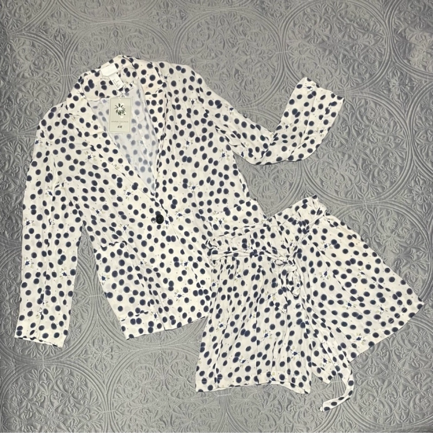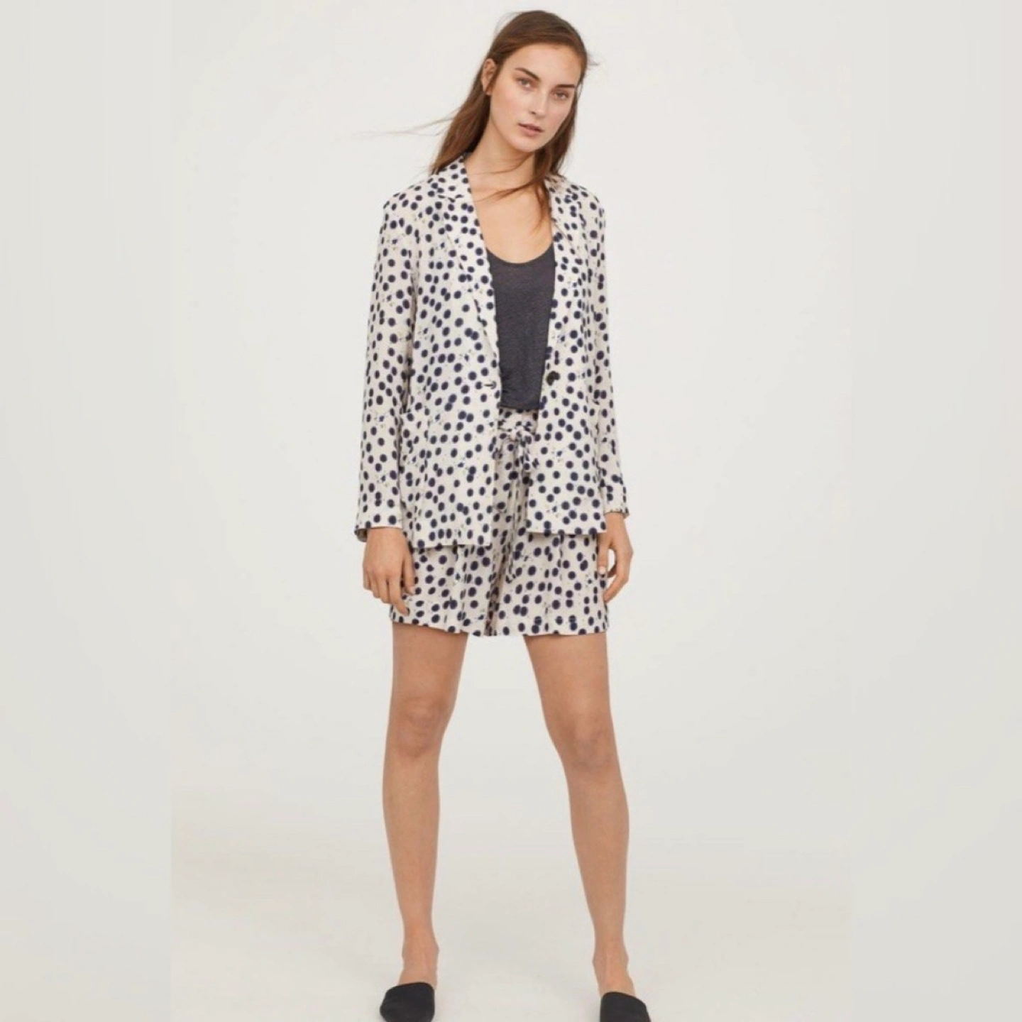 ANNA GLOVER × H&M. Straight-cut jacket and Paper bag Shorts Size: Blazer Size 4 Shorts Size 6 Materials: 100% Viscose ANNA GLOVER × H&M. Straight-cut jacket in patterned viscose crêpe with notch lapels, gently dropped shoulders and long sleeves, Patch front pockets and a one-button fastening at the front. Unlined. Sleeve Length: Long sleeve Description: Cream, Spotted, Butterflies Concept: EVERYDAY FASHION Collection: Anna Glover × H&M ANNA GLOVER × H&M. Shorts in a patterned crêpe weave with a high, elasticated paper bag waist and tie belt. Pleats at the top, zip fly, a concealed hook-and-eye fastener and side pockets. Waist Rise: High waist Style: Paper bag Description: Cream, Spotted, Butterflies Concept: EVERYDAY FASHION Collection: Anna Glover × H&M