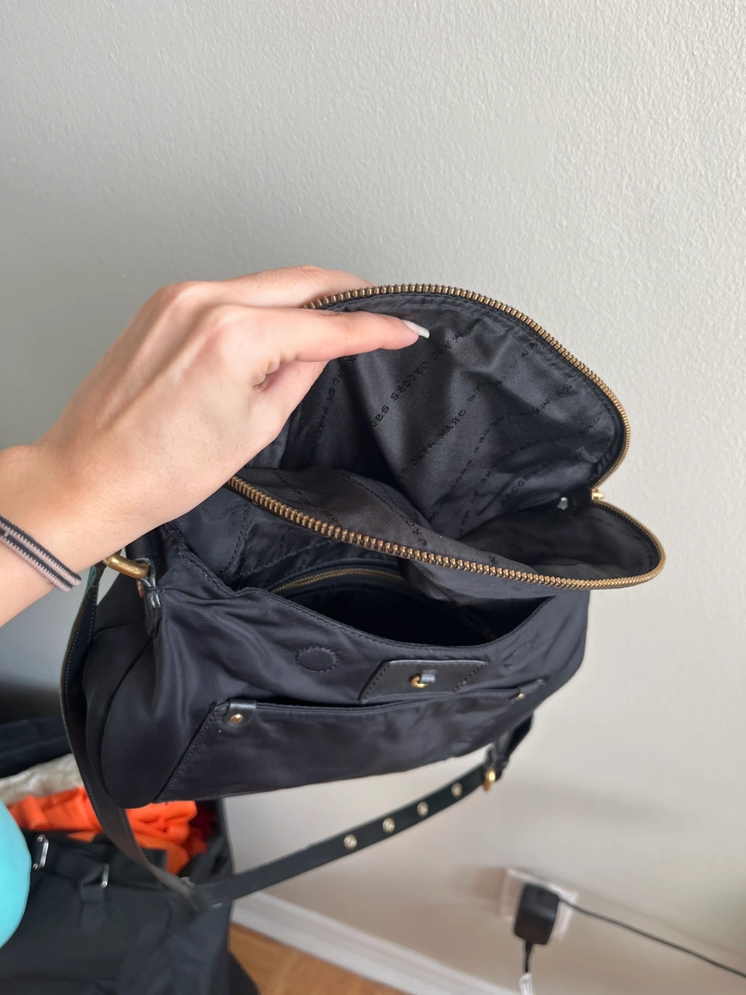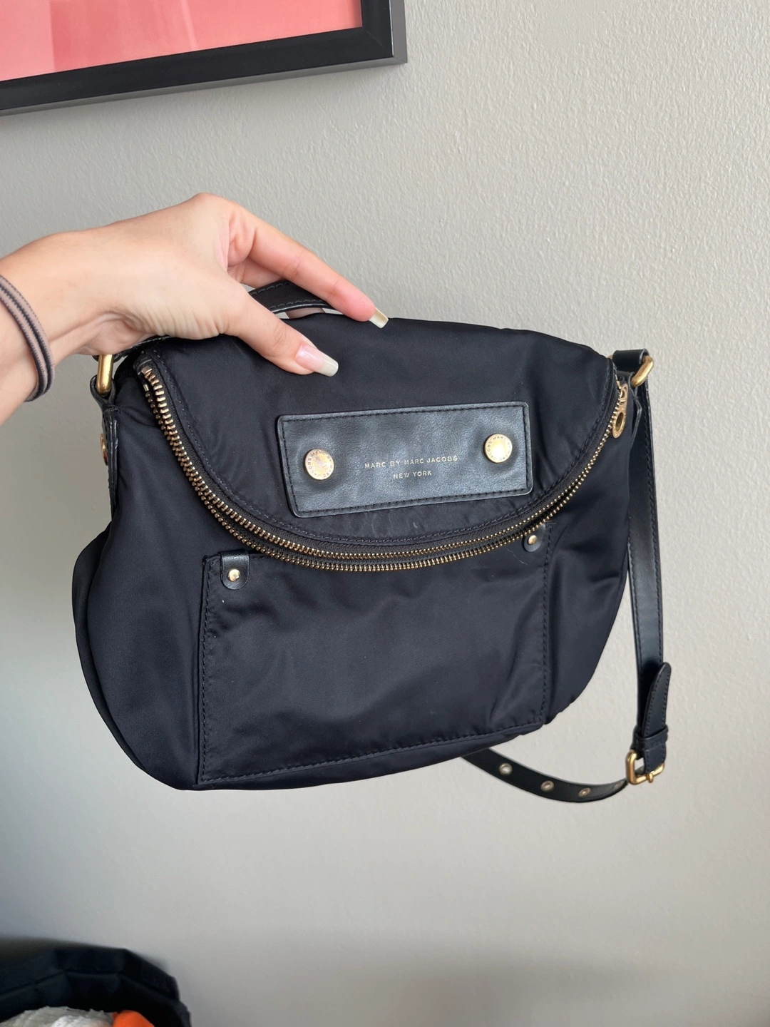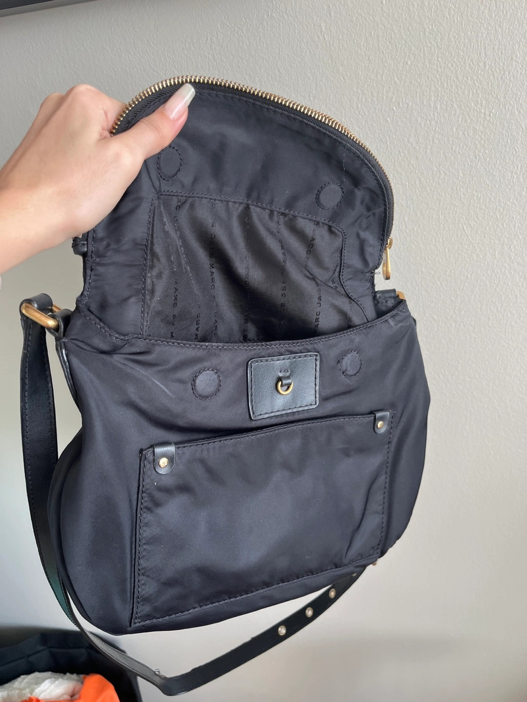 Black nylon crossbody bag. Features a zip closure, adjustable strap, and multiple compartments. Gold-tone hardware accents. Has lots of space