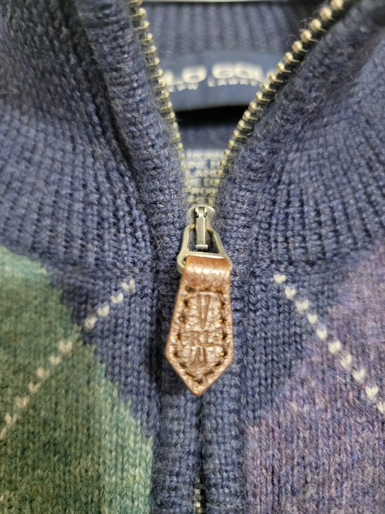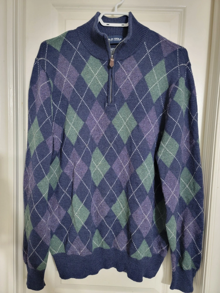 Men's Polo Golf Ralph Lauren sweater. Half-zip design. Argyle pattern in shades of purple, green, and navy. Made of 75% merino wool, 19% lambswool, and 3% cashmere. Size L/G.