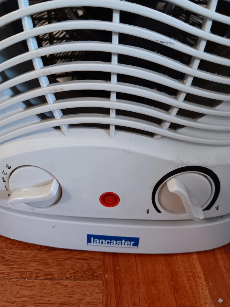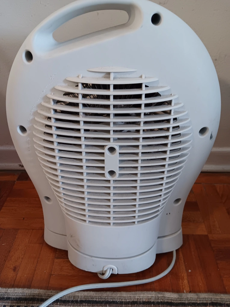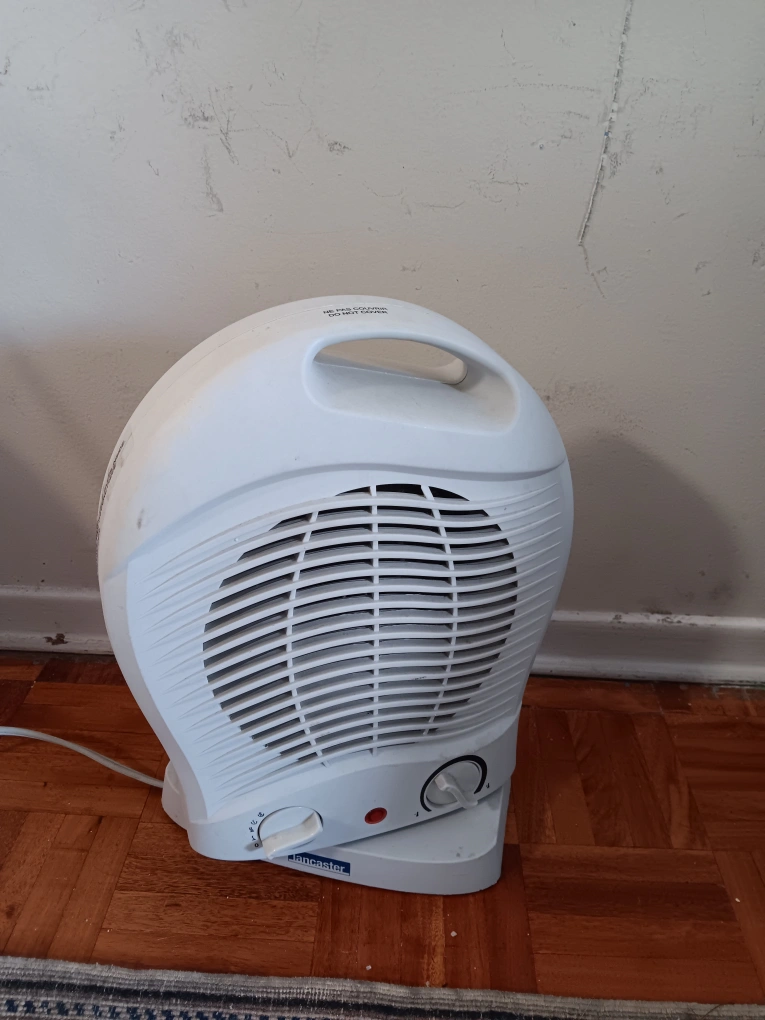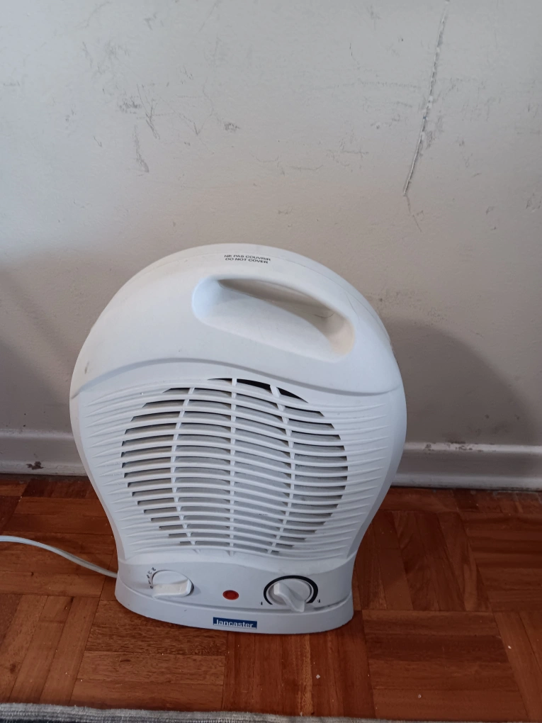 Small white portable heater. Features two knobs for temperature and fan speed. Includes a carrying handle. Like new Pick up only