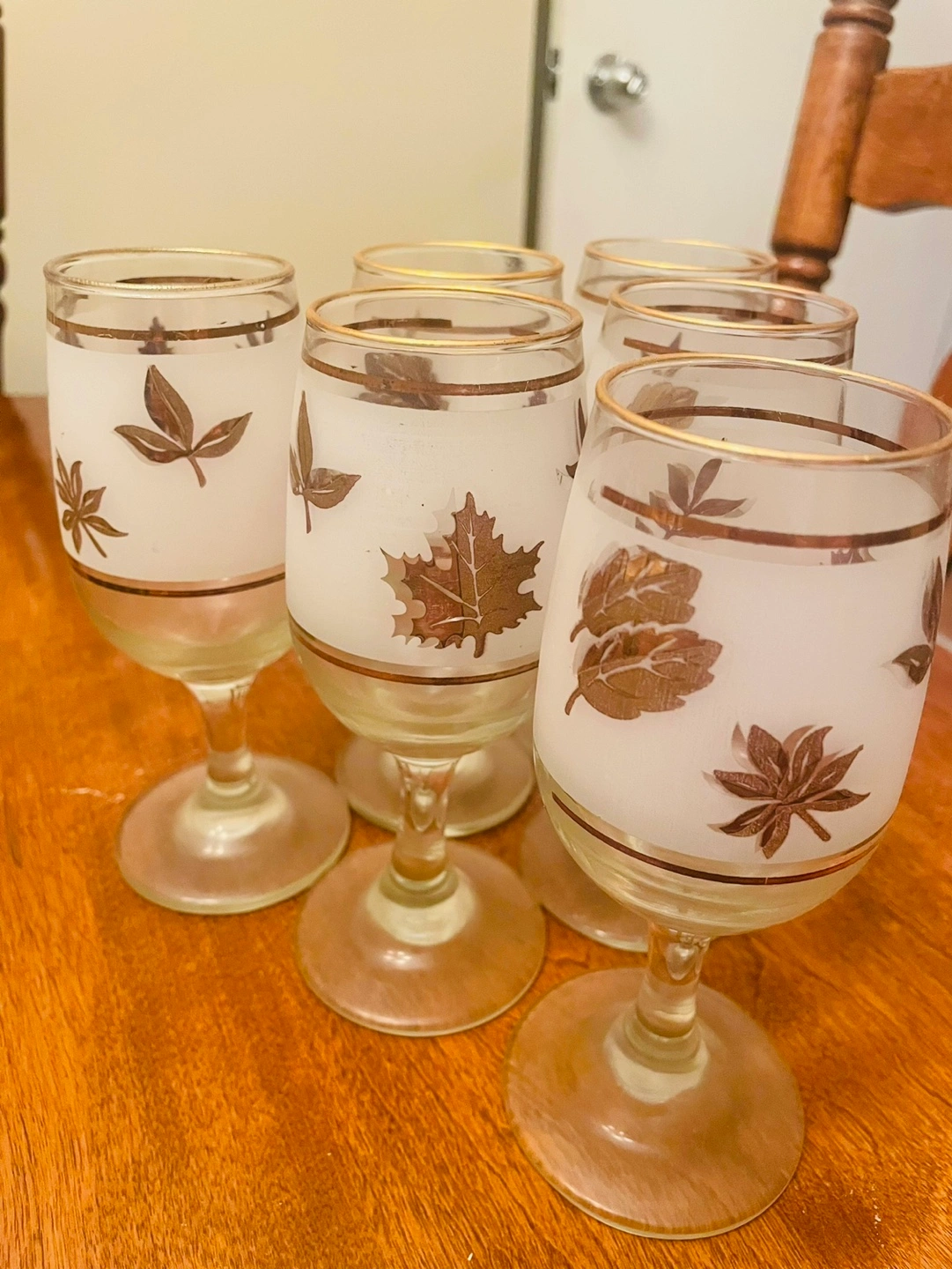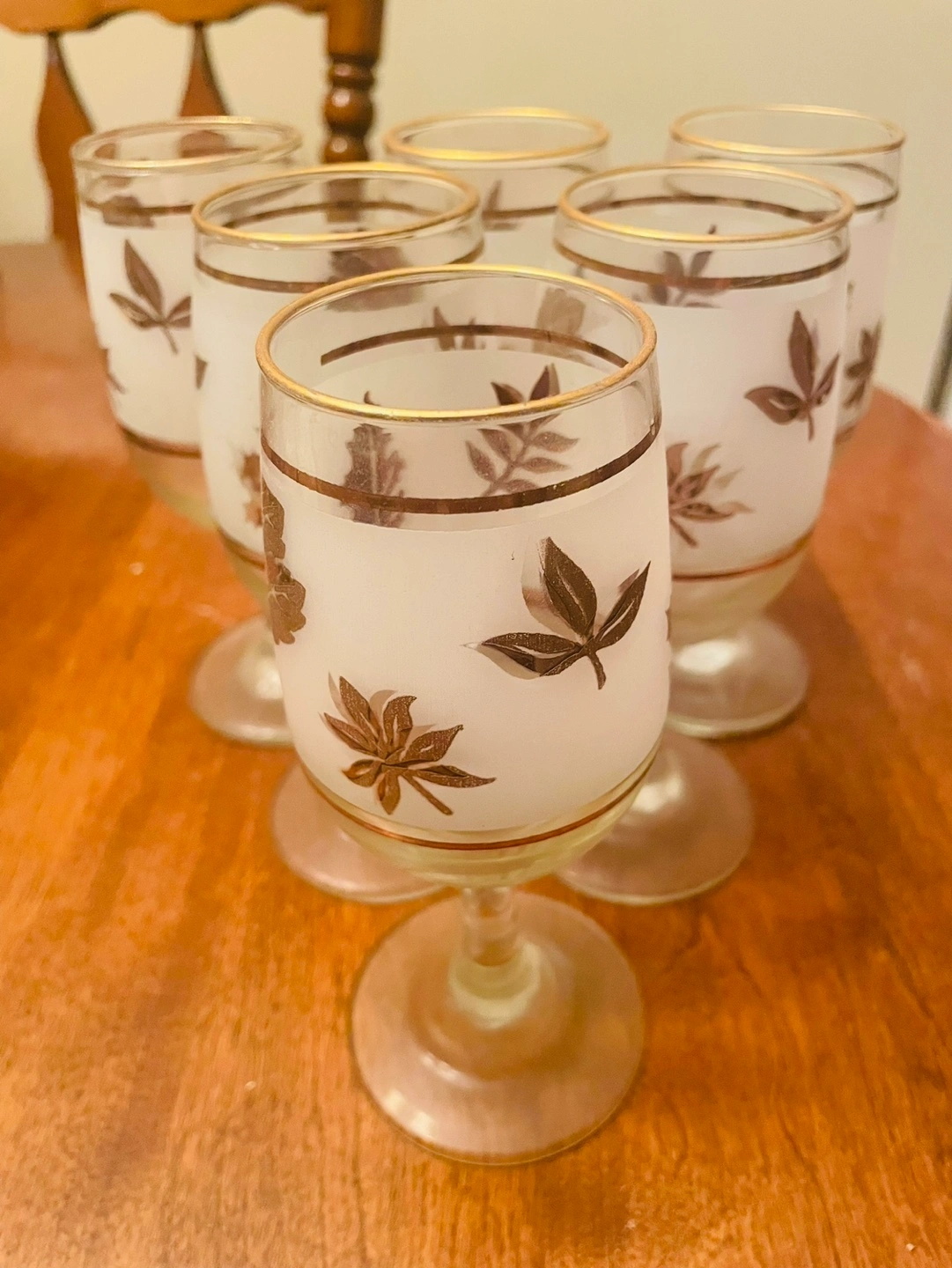 Six vintage stemmed wine glasses. Frosted glass with silver leaf design and gold rim. Elegant and unique. Perfect for entertaining.