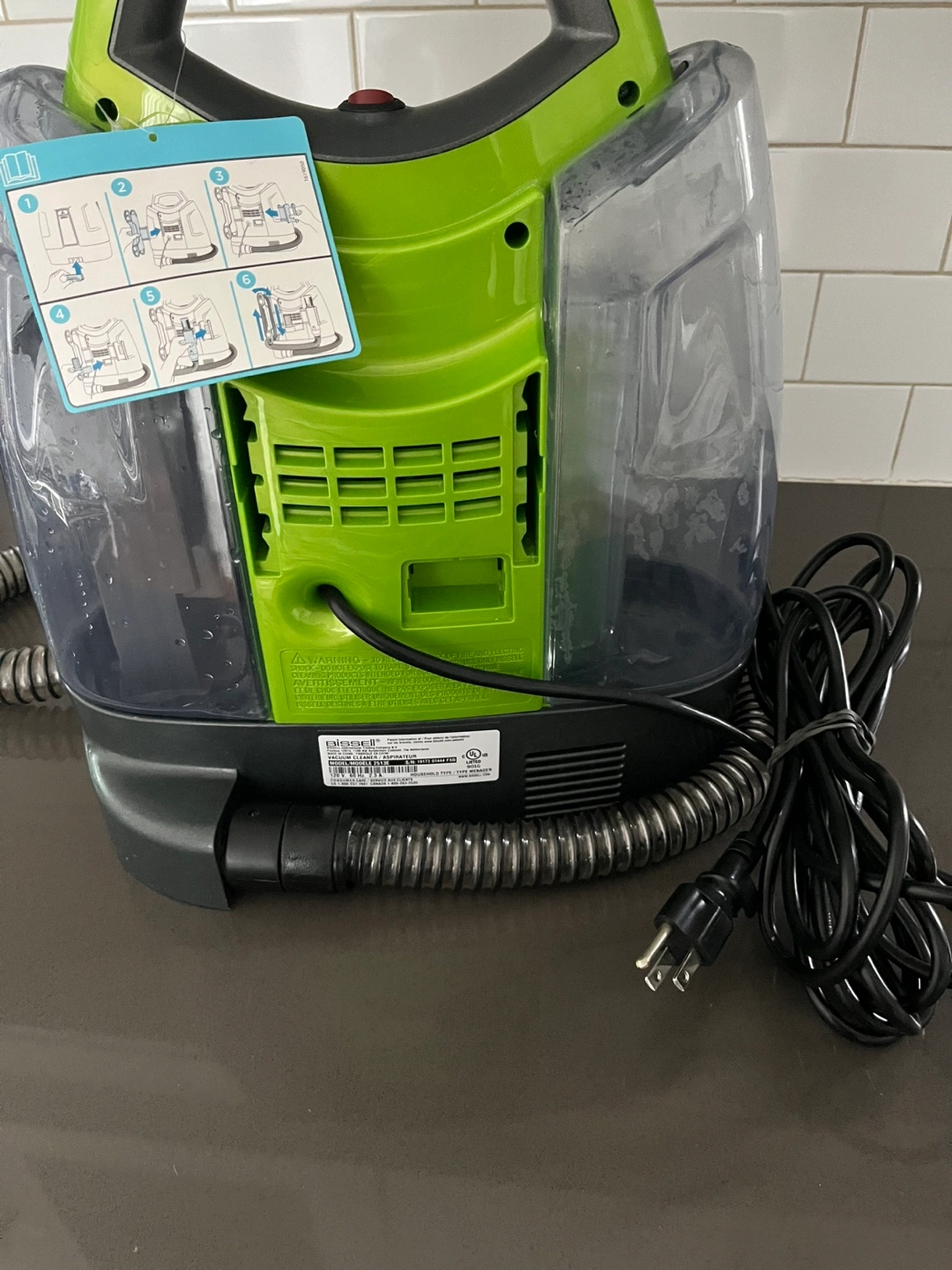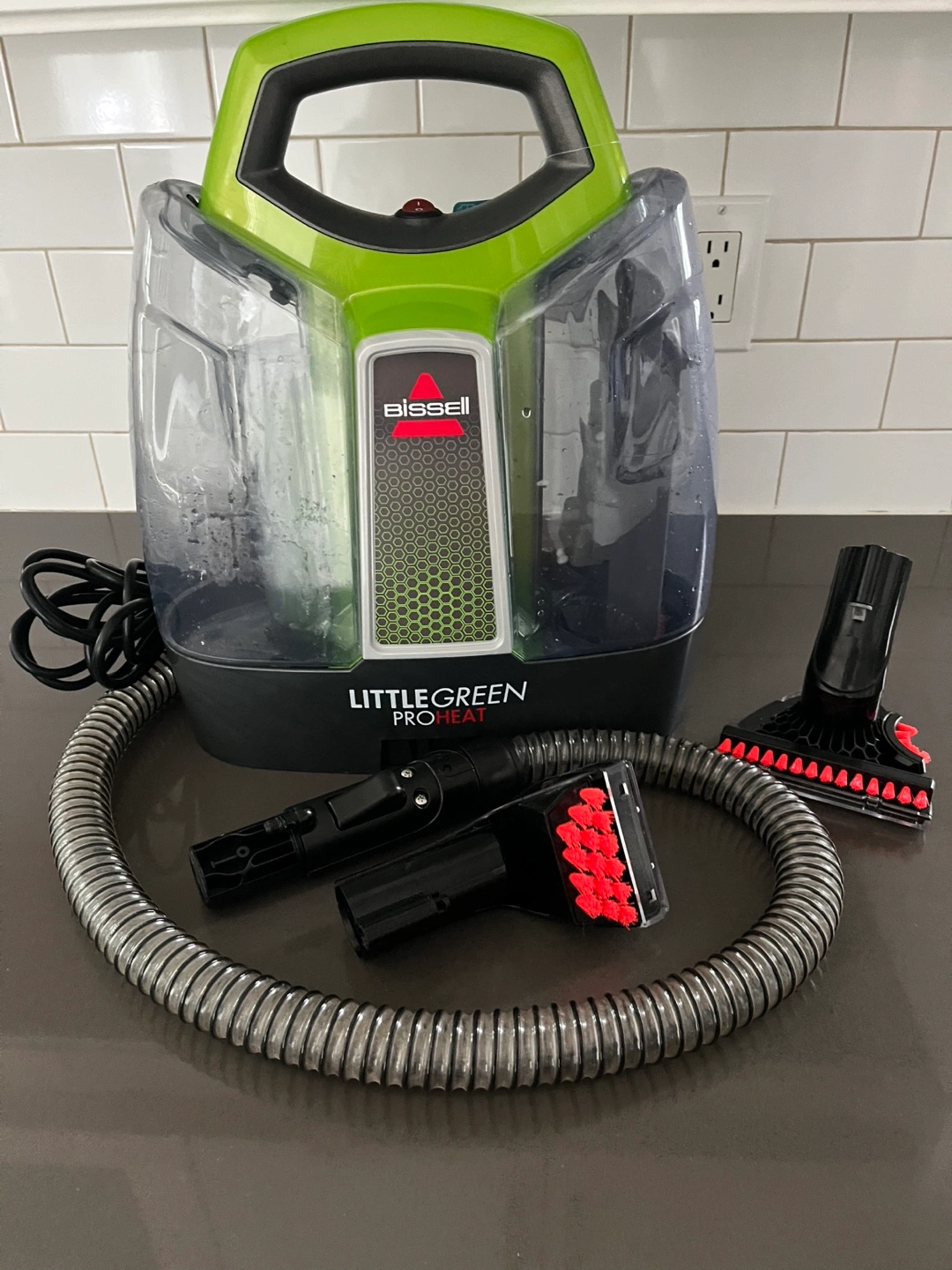 Bissell Little Green ProHeat portable carpet cleaner. Model 2315E. Gently used. Missing some parts ( cord wrap clip, hose holder clip and wand holder clip)