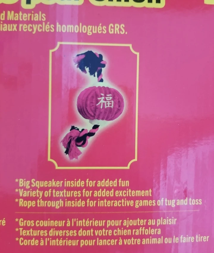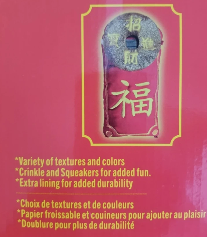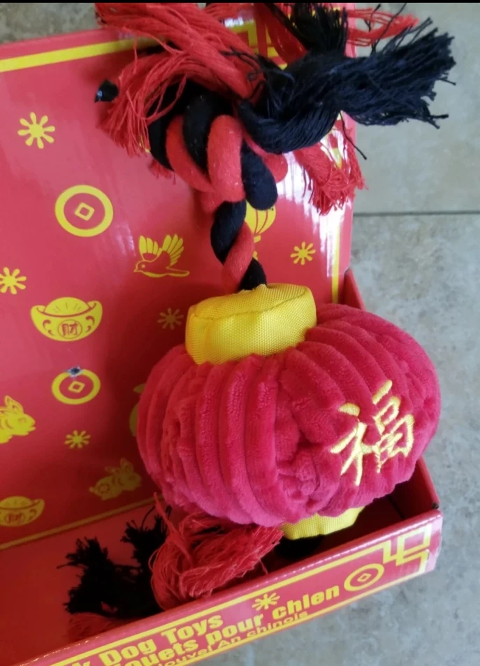 2 new dog toys. Features crinkle and squeaker elements. Variety of textures and colours. Durable construction. Chinese New Years them. Twi pieces left from a set of 3.