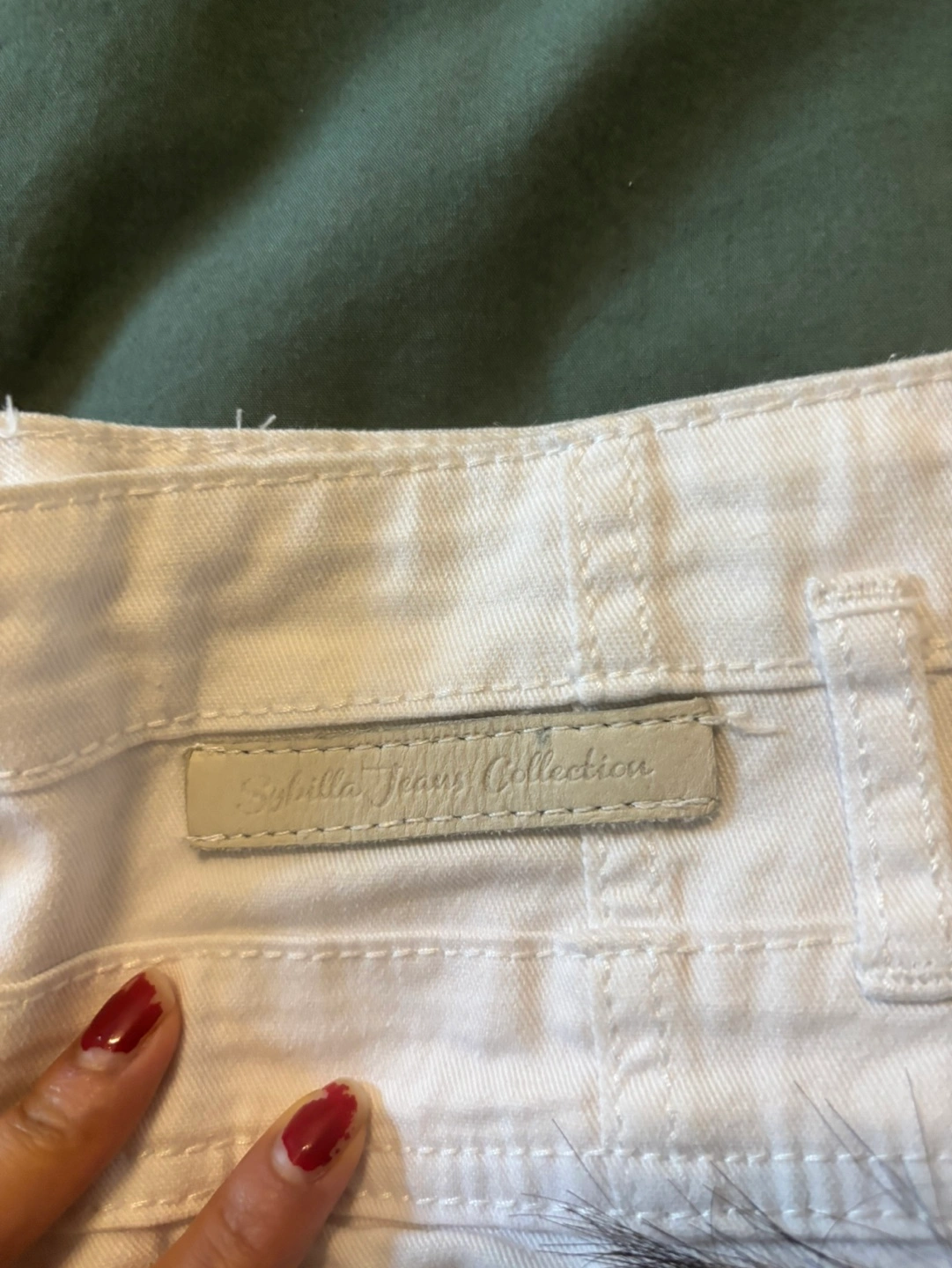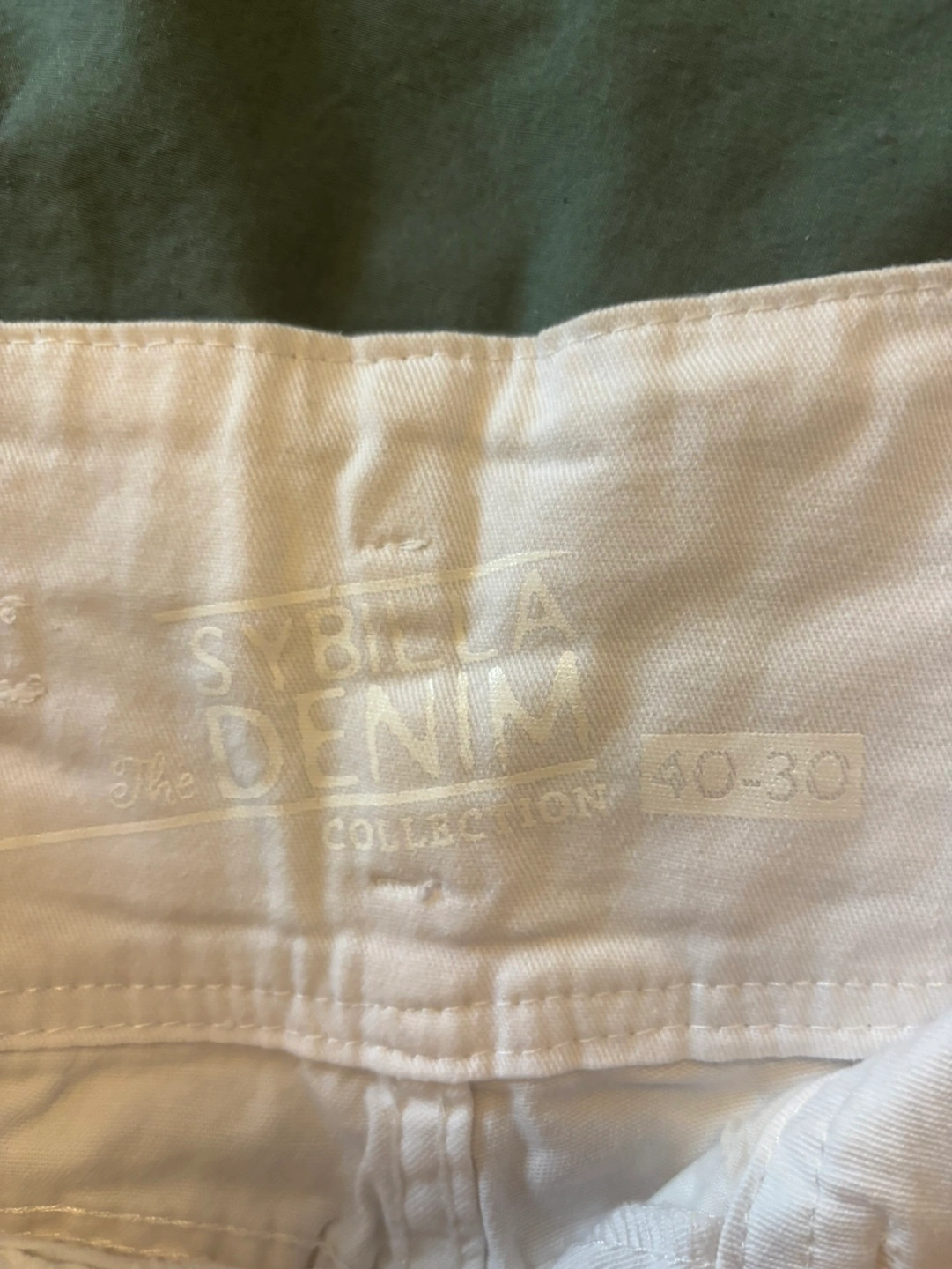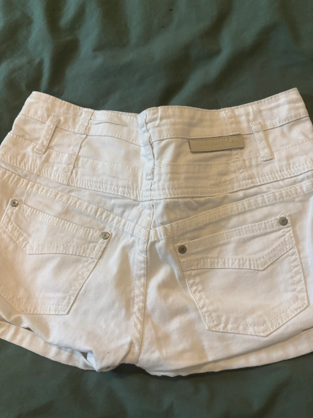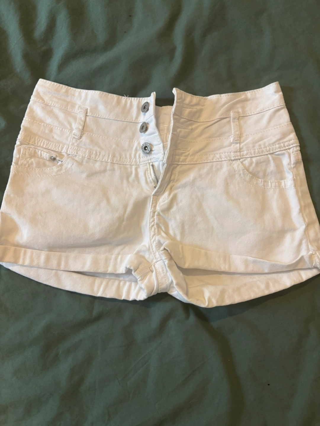 Women's white denim shorts. Size 40-30. High-waisted. Five-pocket style. Rolled cuffs. Button and zip closure.