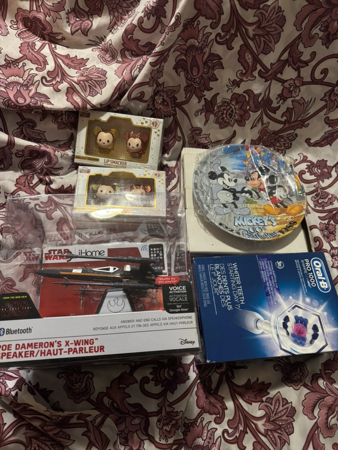 Grab this exciting bundle featuring a new Oral-B Pro 1000 rechargeable toothbrush, a pair of limited-edition Disney Tsum Tsum Lip Smacker sets, a Star Wars iHome Poe Dameron's X-wing Bluetooth speaker, and a vintage 1988 Mickey Mouse commemorative plate. Perfect for collectors or Disney fans! Mickey Mouse collectors plate Plate frame Tsum Tsum limited Edition Disney x2 Star Wars Poe Damerons x wing speaker works with Siri and google now-Voice activation. Oral B pro 1000 power toothbrush brand new. Everything in this listing is brand new.