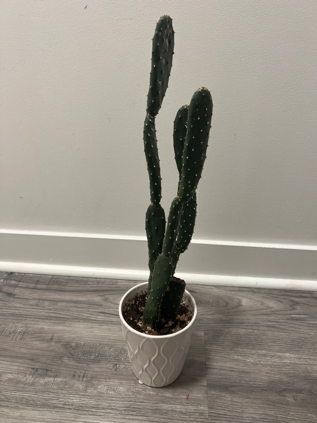Potted cactus, several stems, dark green colour. Planted in a small white textured pot.