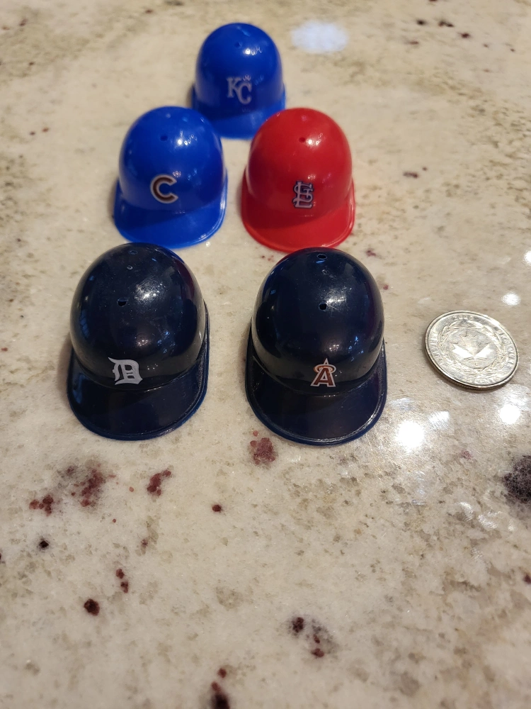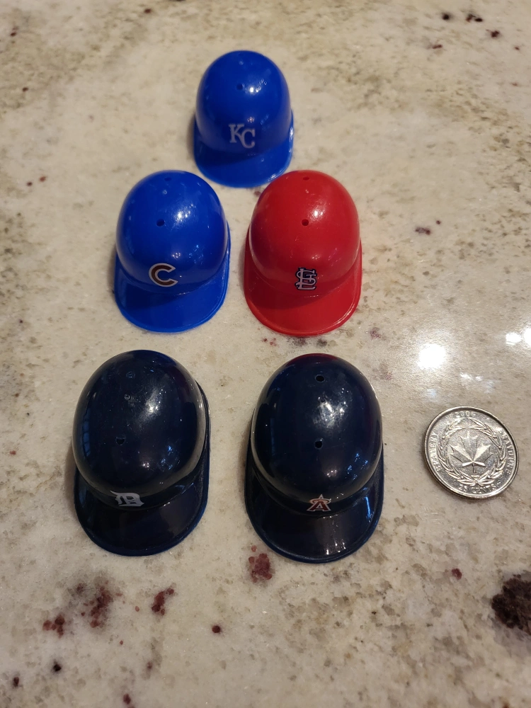 Collection of five miniature plastic baseball helmets. Features various MLB team logos. Great for collectors or display. Small size, approximately the size of a loonie. Vintage Plastic Mini Baseball Helmets $5