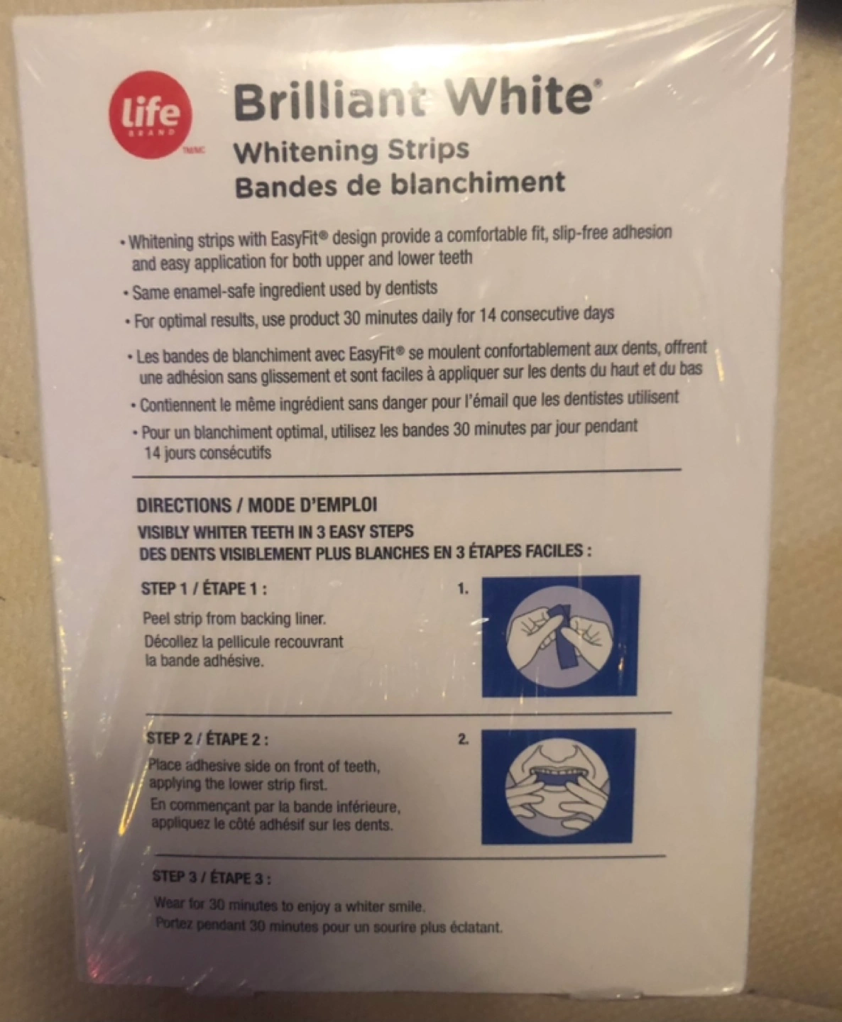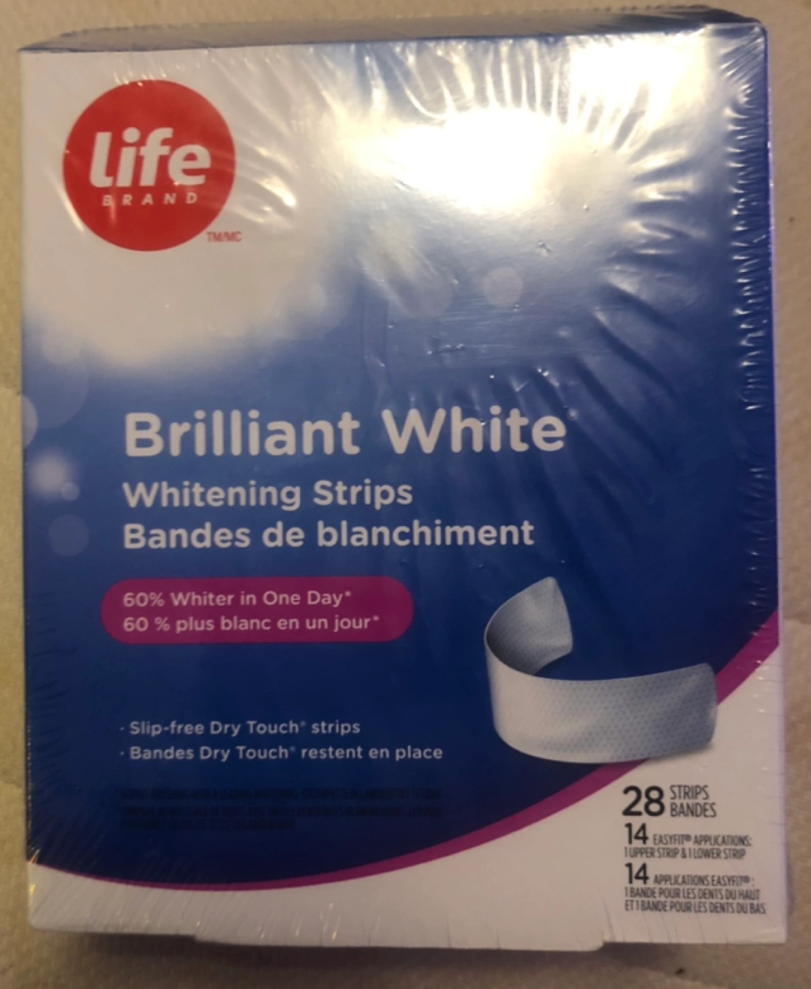 New, unopened box of Life Brand Brilliant White Whitening Strips. 28 strips total, 14 upper and 14 lower. Easy application, comfortable fit, slip-free. 60% whiter in one day. For optimal results, use for 14 consecutive days, 30 minutes daily.