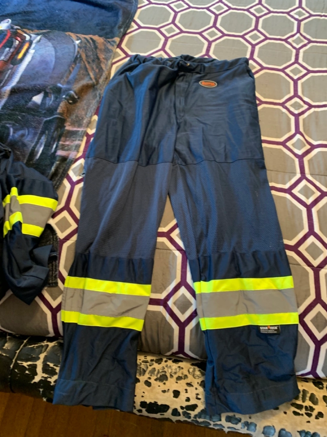 Like new work pants. Size large. Blue with neon yellow reflective strips. Breathable mesh panels at knees. Zippered leg openings. $25 EACH. There is 4 pairs.