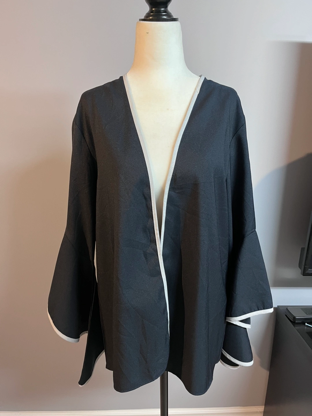 Black jacket, size medium. Bell sleeves. Light grey trim detail. Open front.