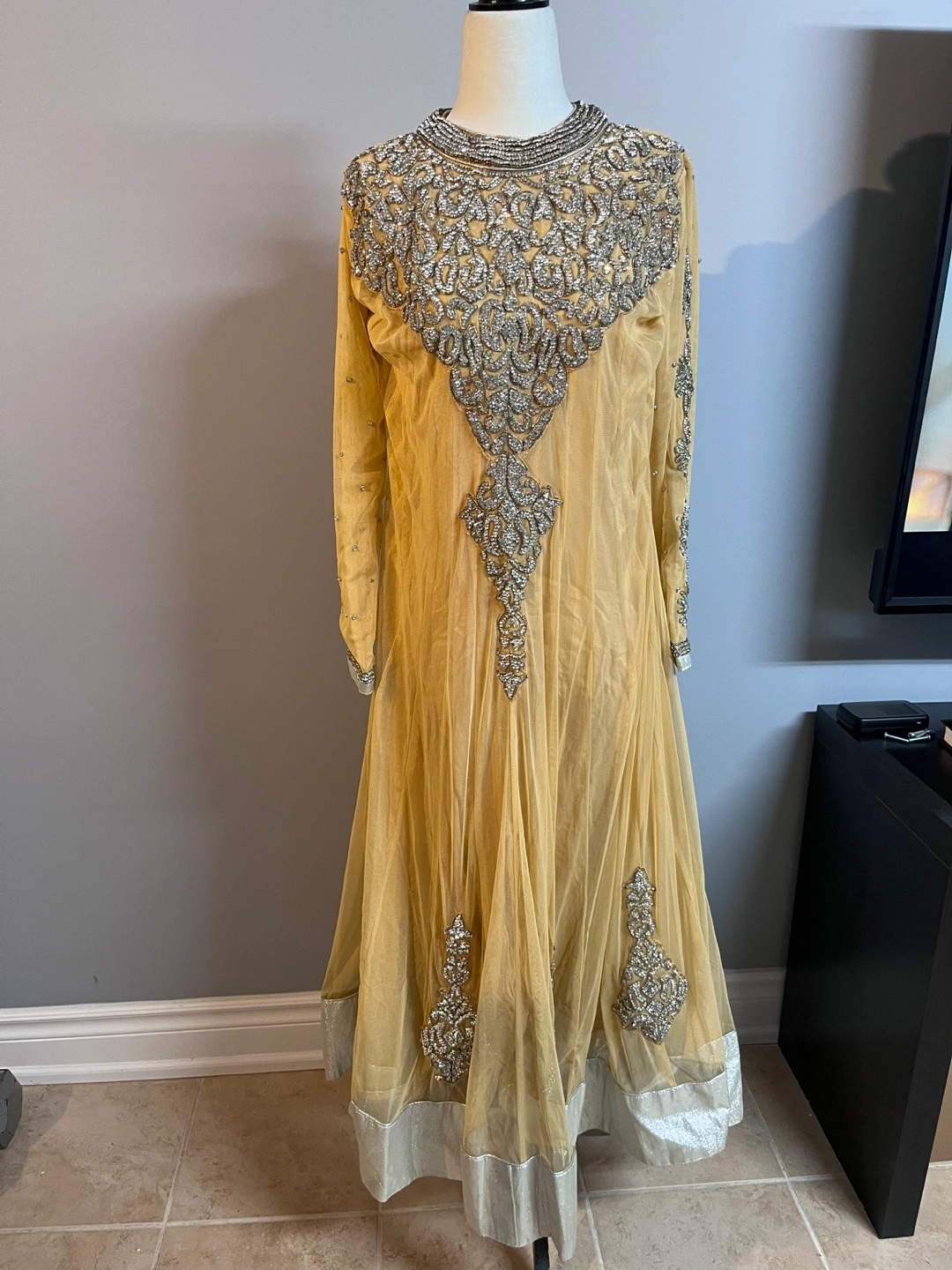 Gorgeous beige shalwar kameez. Intricate silver embroidery. Long sleeves. Comes with matching dupatta and churidar pants.