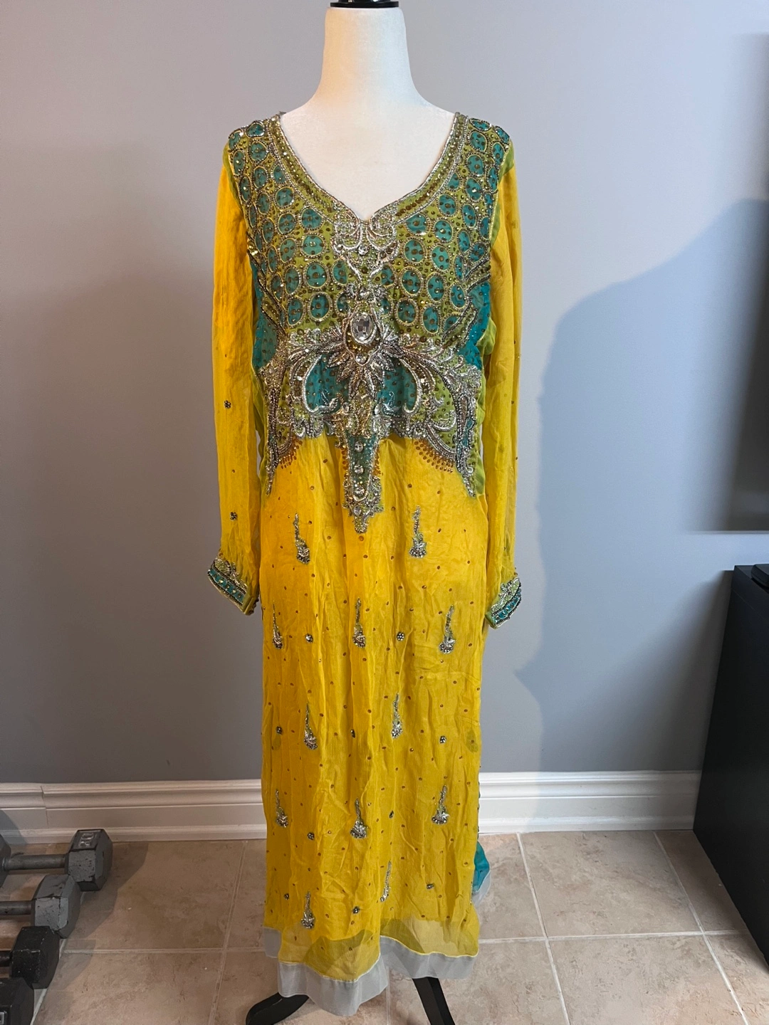 Beautiful yellow and teal shalwar kameez. Intricate embellishments throughout. Long sleeves. Includes matching dupatta and yellow churidar.