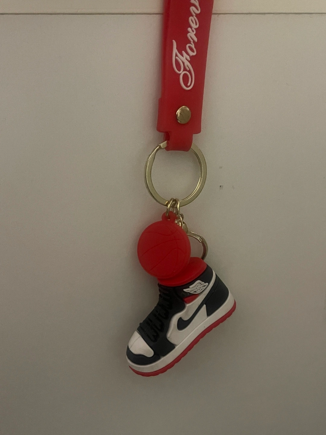 Cute Air Jordan keychain. Features miniature Air Jordan shoe and basketball. Red silicone strap with Forever lettering. Gold-toned metal ring.
