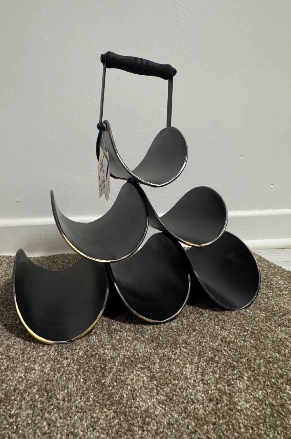 Six-bottle wine rack. Black metal construction. Features a convenient carrying handle. Distressed gold accents.