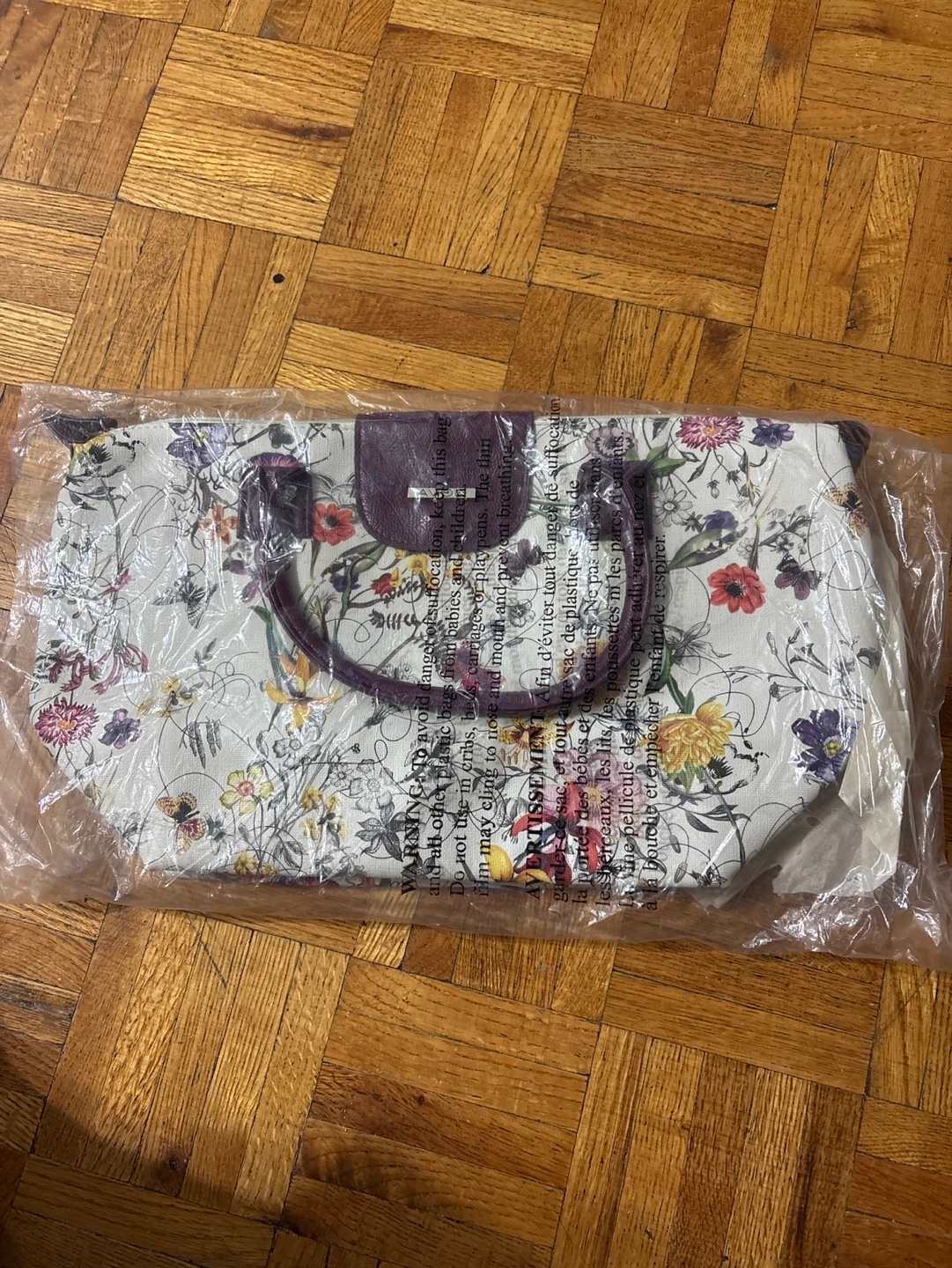 New lunch bag. Floral print. Purple handles. Packaged in plastic.