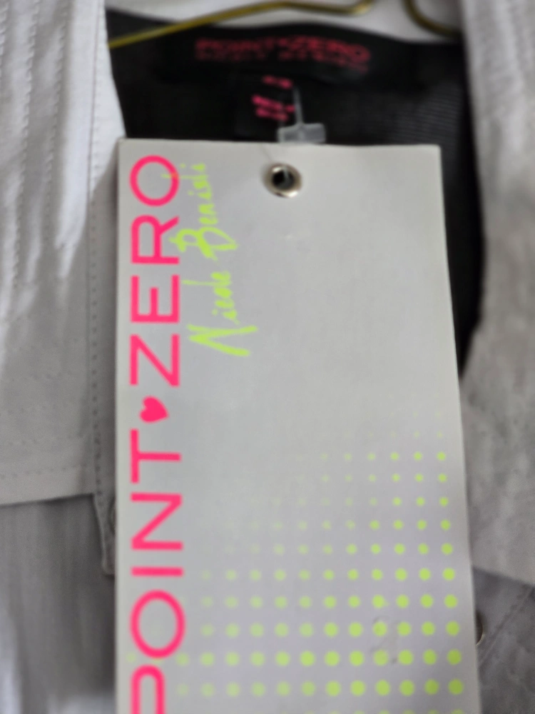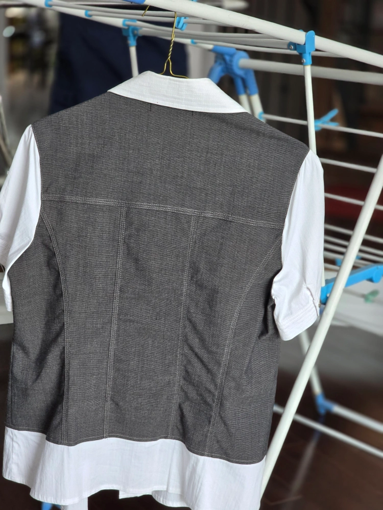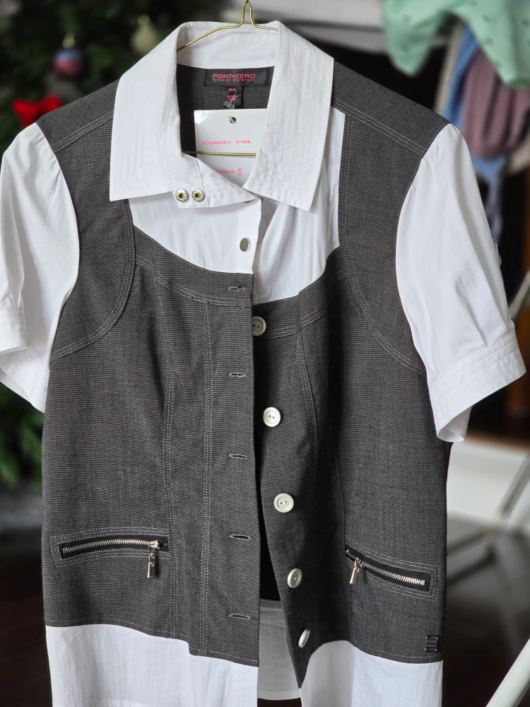 Unique design. Grey and white. Short sleeves. Button closure. Two zippered pockets. Size M.