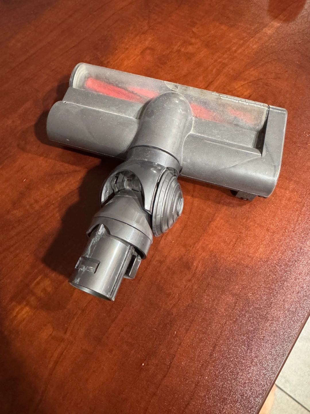 Used Dyson vacuum cleaner soft roller head attachment. Grey plastic. Shows some wear. Suitable for various Dyson models. Includes rotating brush bar.