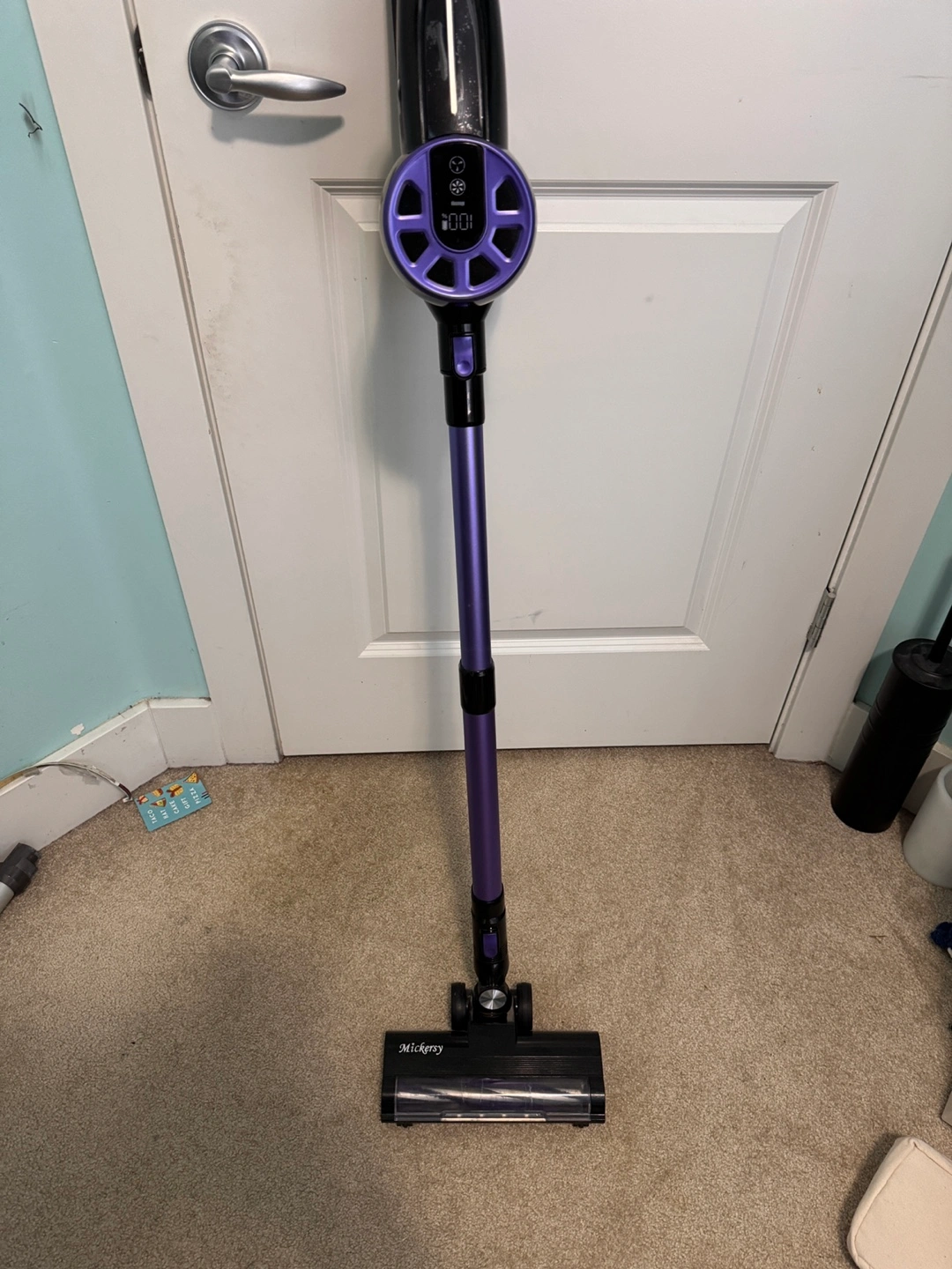 Lightweight and powerful cordless vacuum. Purple and black. Multiple settings. Great for quick cleanups. Comes with charger and extra filter