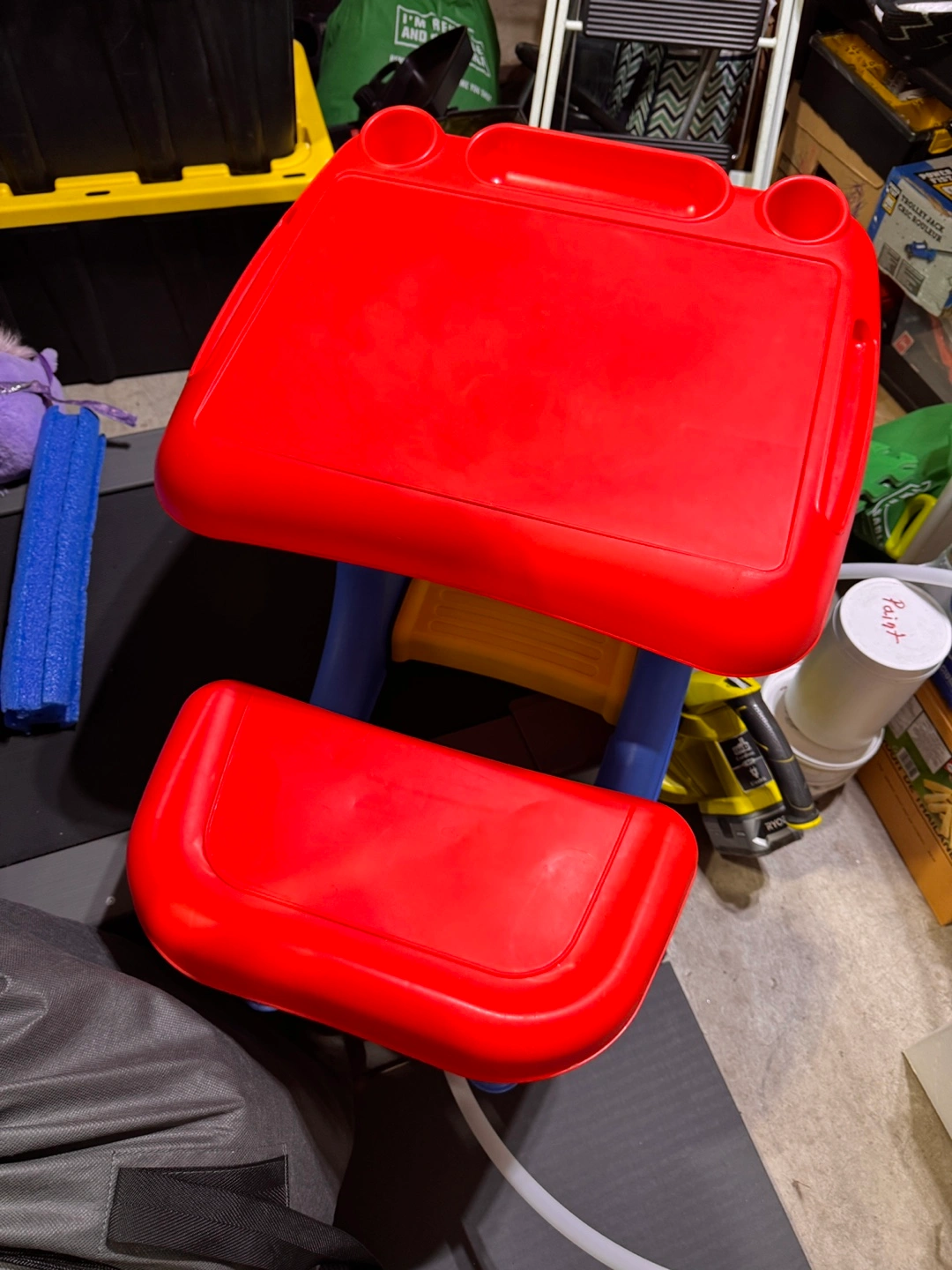 Durable plastic construction. Features a small table with cup holders and attached chair. Ideal for toddlers and preschoolers. Compact size, easy to store.