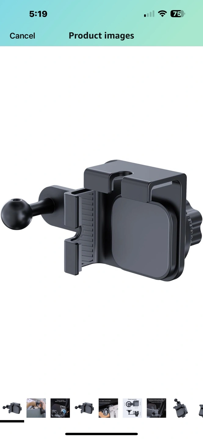 Adjustable phone holder. Attaches to headrest. Ball joint for flexible viewing angles. Compact and sturdy design.