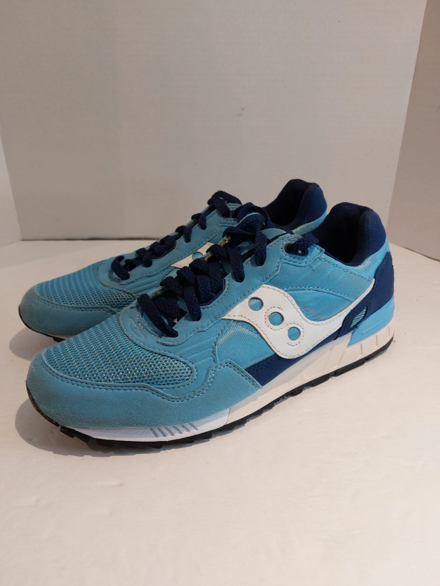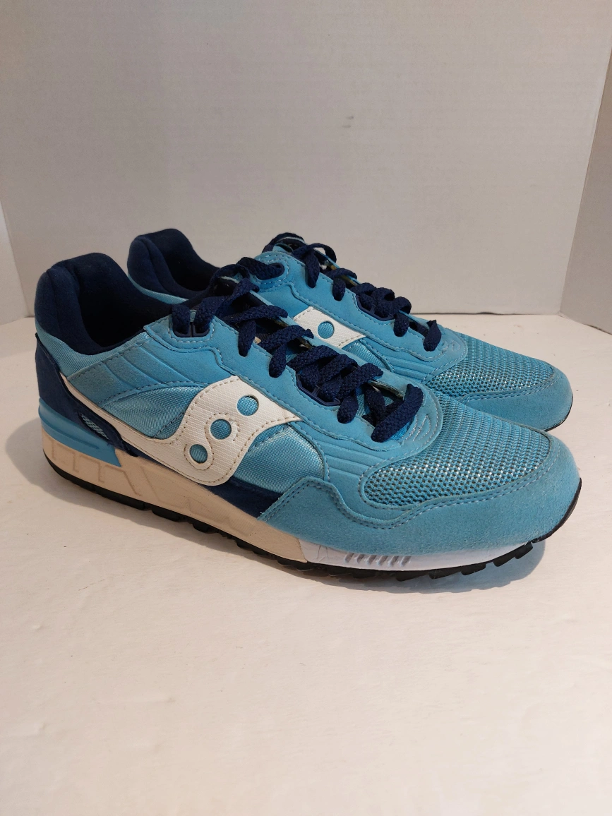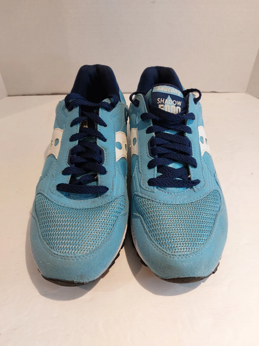 Men's Saucony Shadow 5000 Sneakers - Light Blue and Navy Pair of Saucony Shadow 5000 running shoes. Light blue suede and mesh upper. Navy blue accents. Classic sneaker style. Comfortable and stylish.