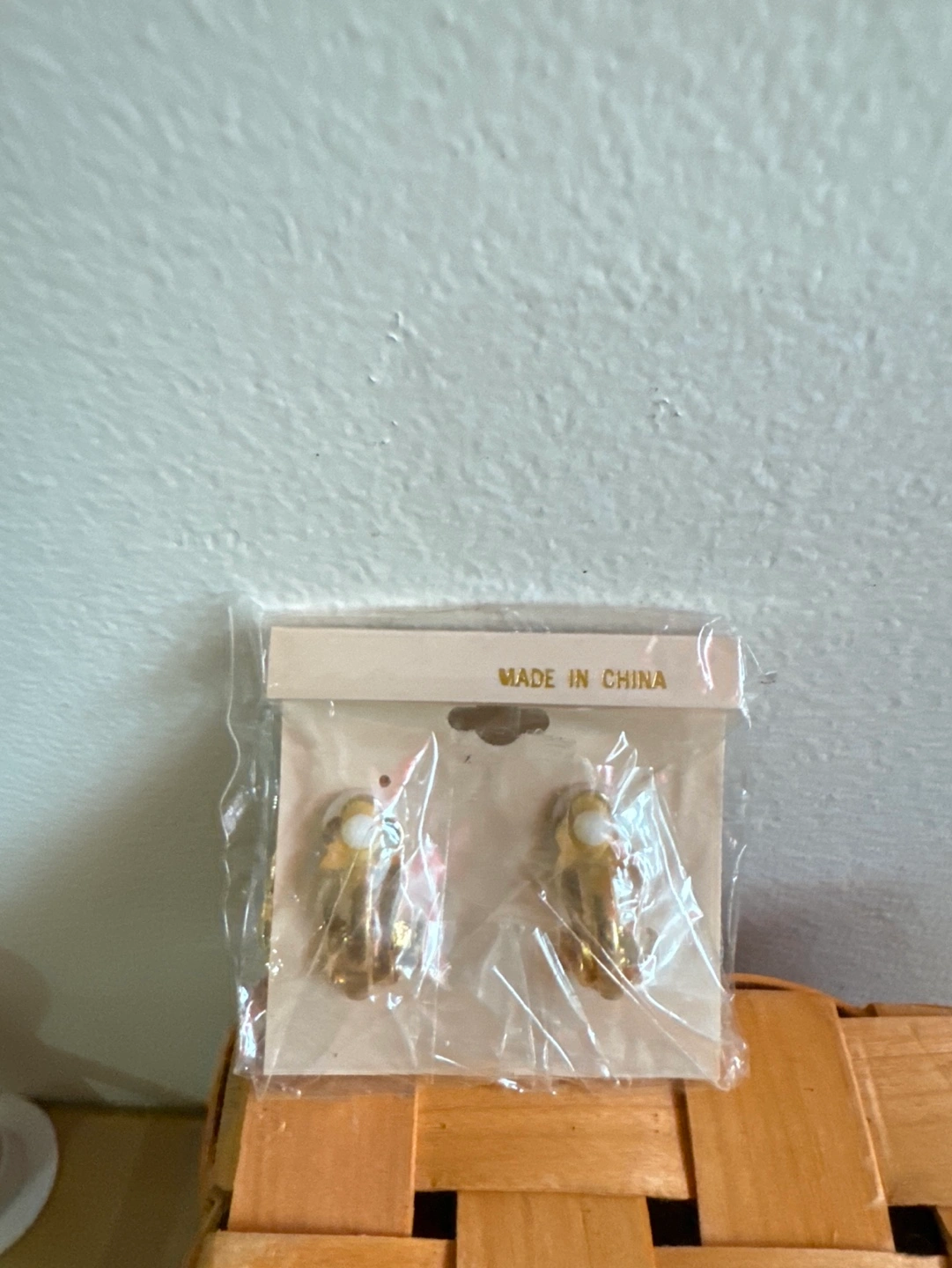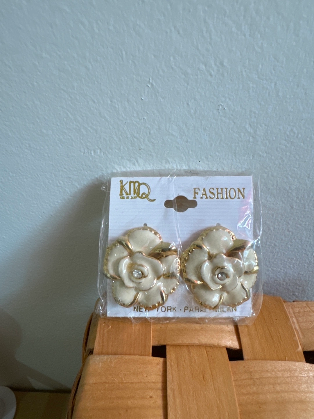 New, never worn. Gold tone metal. White flower design. Rhinestone centre. Clip-on earrings. Made in China.