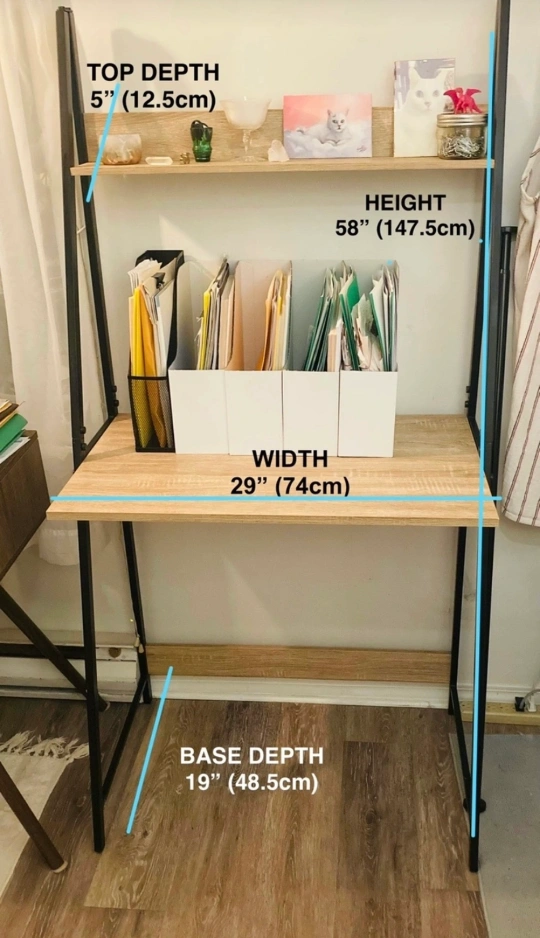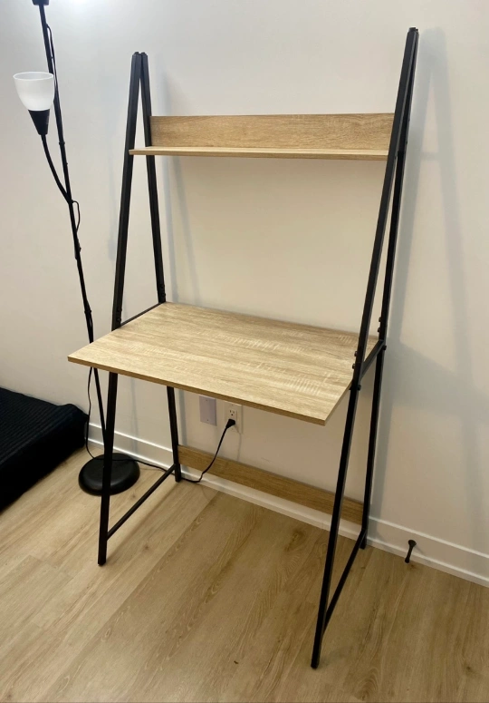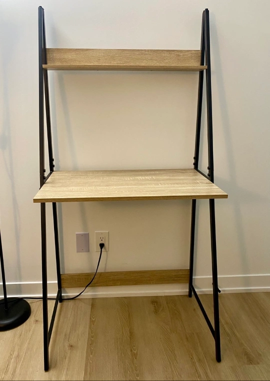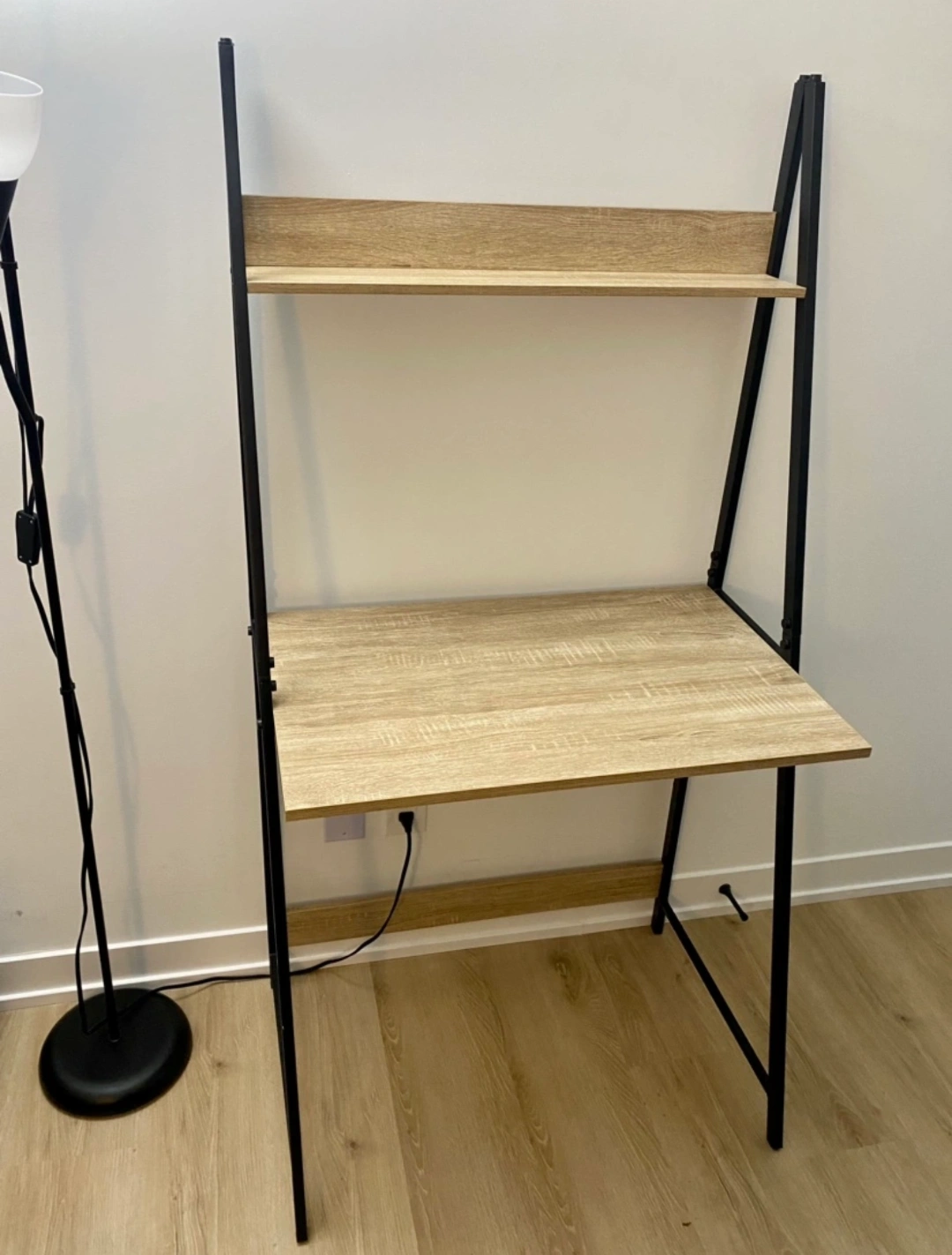 Small writing desk, light oak colour. Black metal frame. Includes an upper shelf. Great for small spaces. Just as new. Very lightly used. It's super aesthetic, light weight and comfortable to use. I am decluttering my room, so selling it. ‼️Grab both the chair and the desk in my listings for $60‼️ pickup near Gerrard and Jarvis st.