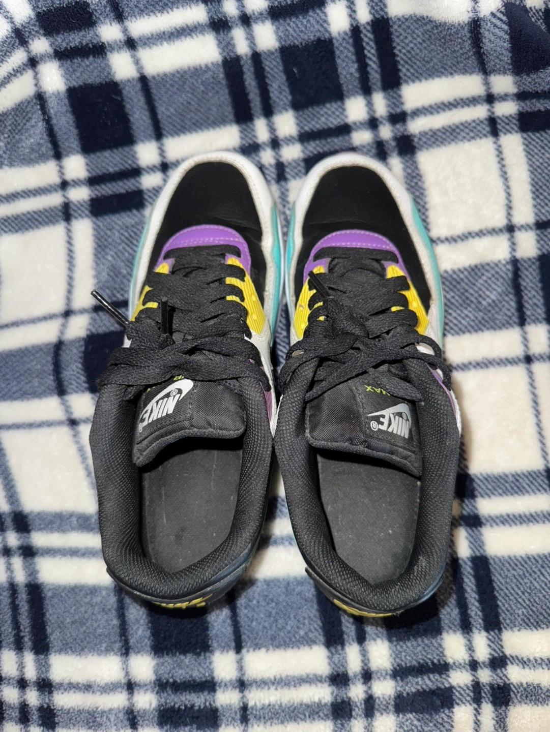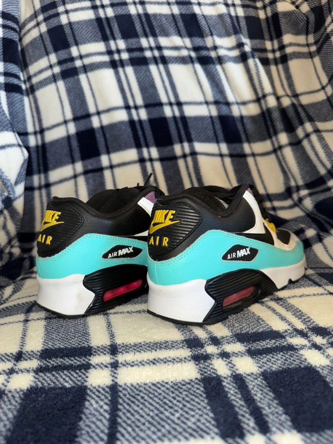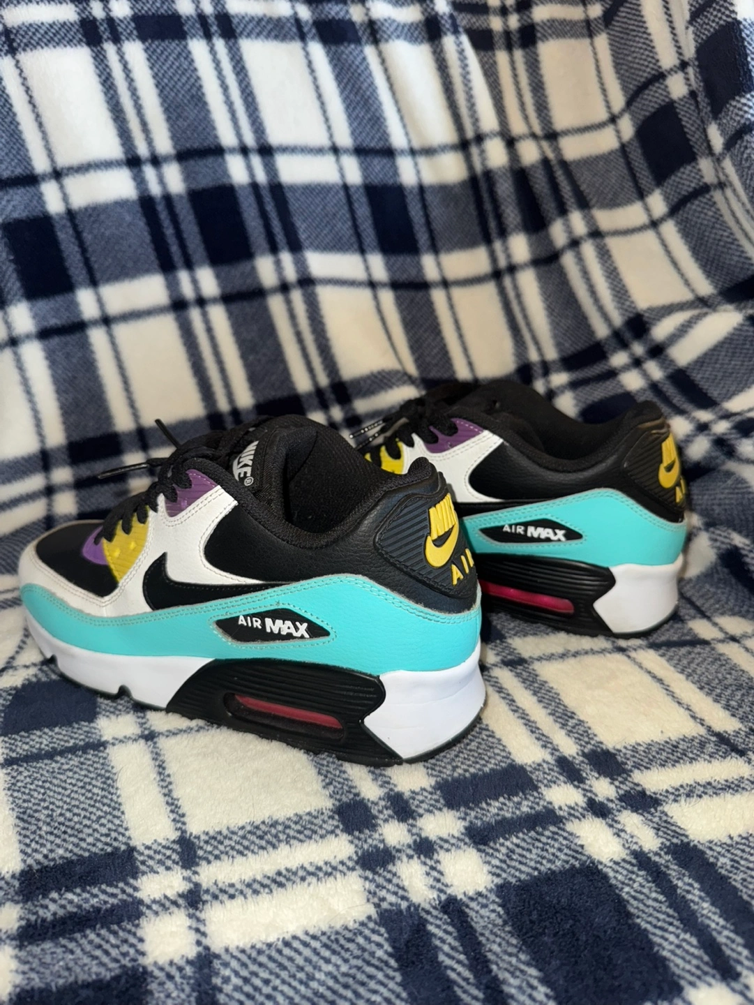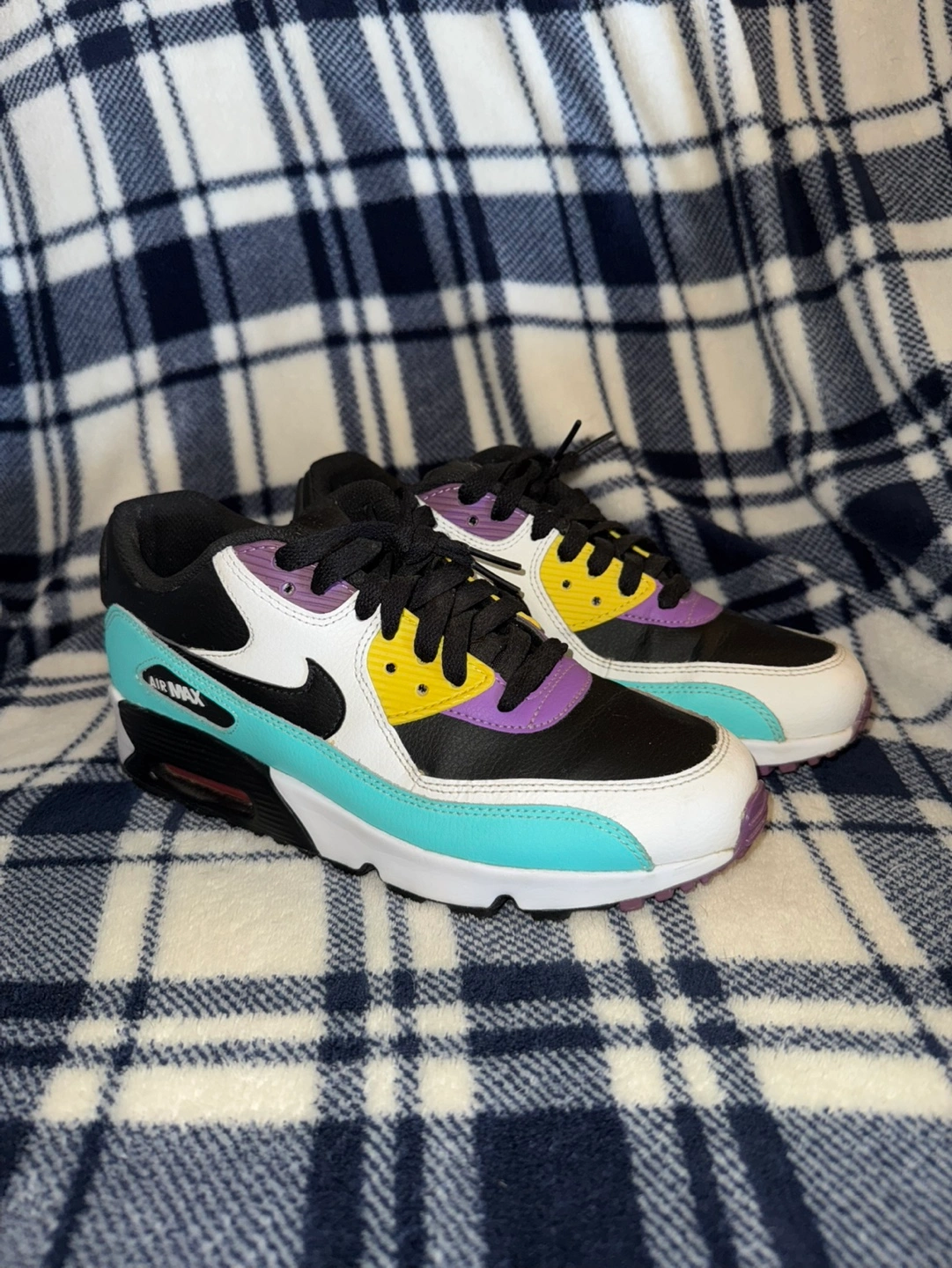 Nike Air Max 90 shoes. Size 6Y. Black, white, teal, and purple accents. Pre-owned, great condition.