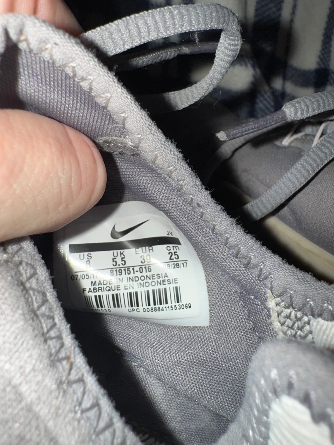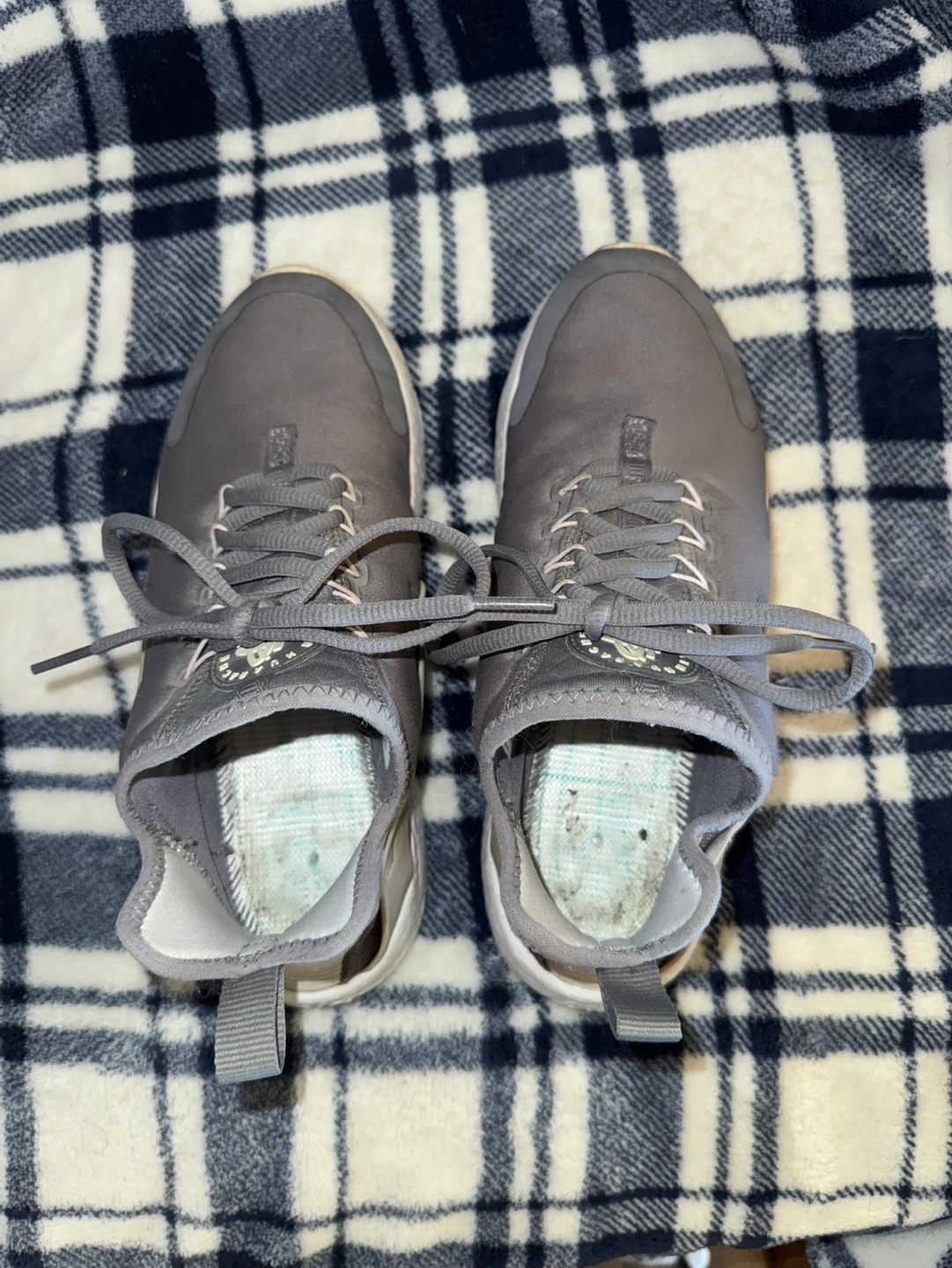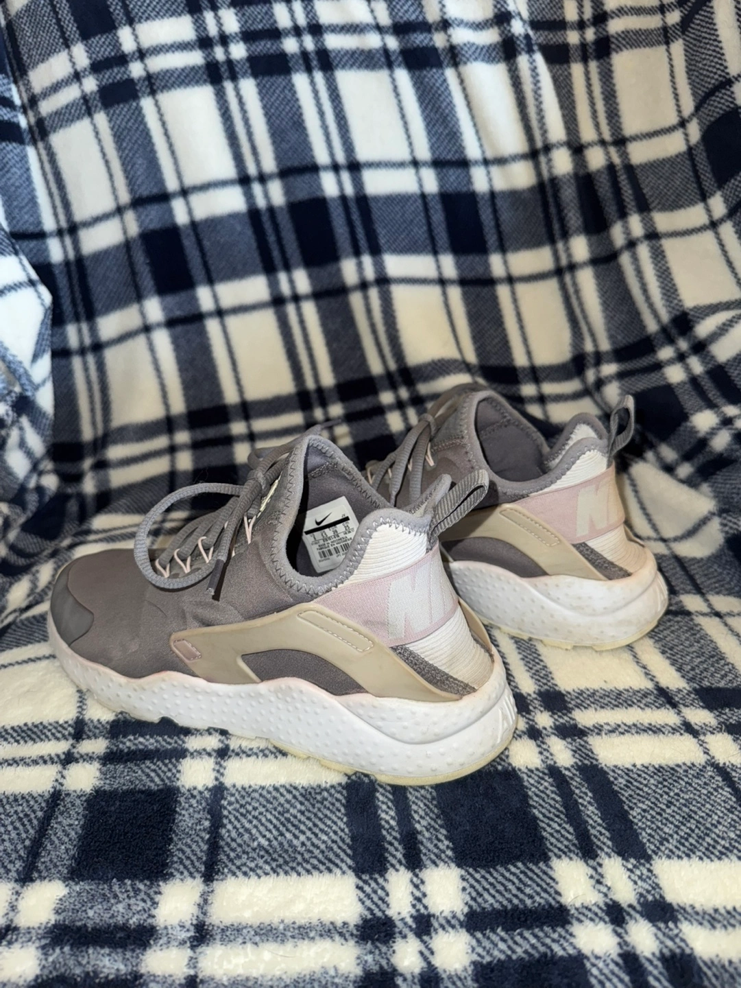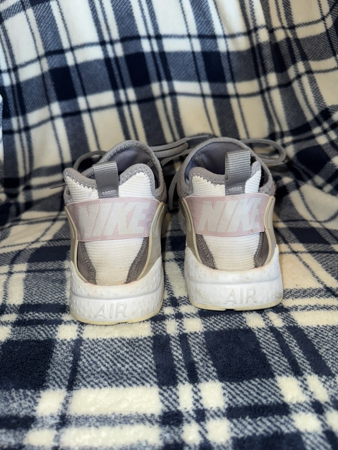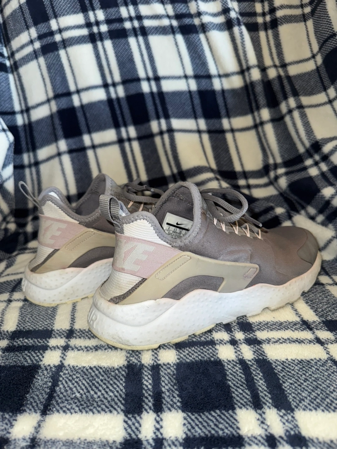 Grey Nike Huarache Run Ultra running shoes. Size 5.5. Lace-up closure. Minimal wear. Had orthotics inserts in them, missing original soles but other than that a great shoe. Comfortable and stylish.