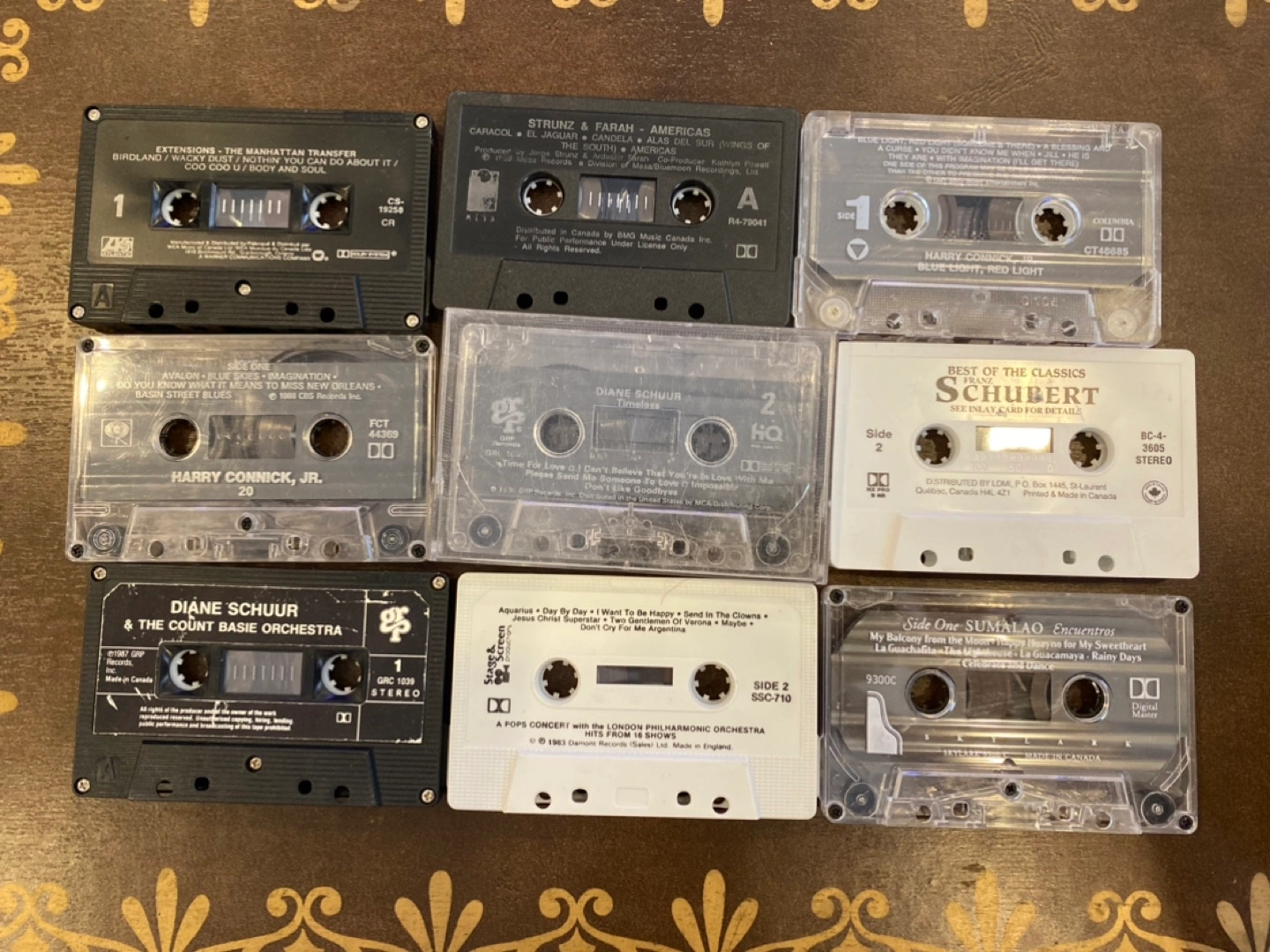 Nine pre-owned music cassette tapes. 80’s & 90’s. Various artists and genres. Includes Harry Connick Jr., Diane Schuur, Schubert, and more. Some tapes show signs of wear.