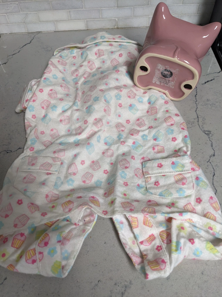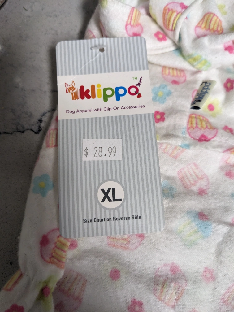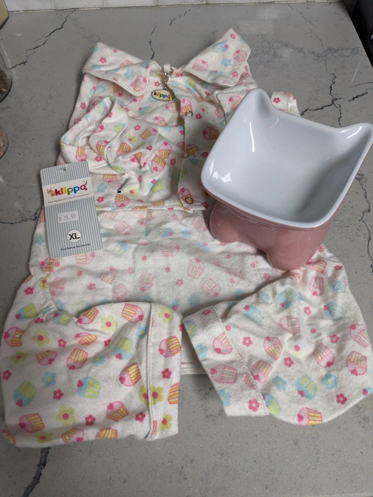 Adorable cupcake-print dog pajamas, tag says XL but fits a medium dog like a shitzu or cocker spaniel. Brand new with tags. Includes a cute pink dog-shaped pet bowl. Perfect for pampered pets!