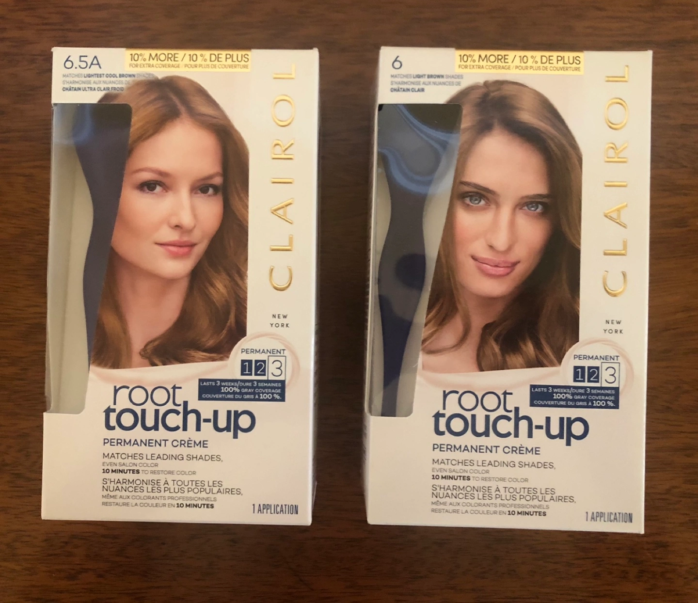 Two boxes of Clairol Root Touch-Up Permanent Crème hair colour. One box is shade 6, Matches Light Brown shades. The other box is shade 6.5A, Matches Lightest Cool Brown shades. Each box contains one application. I stopped colouring my hair so am selling these. Basically two boxes for the price of one. Yonge/Davisville pick up.