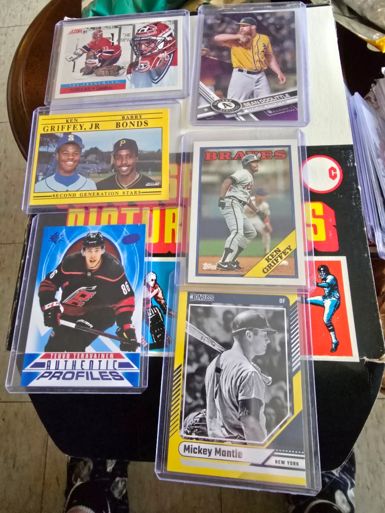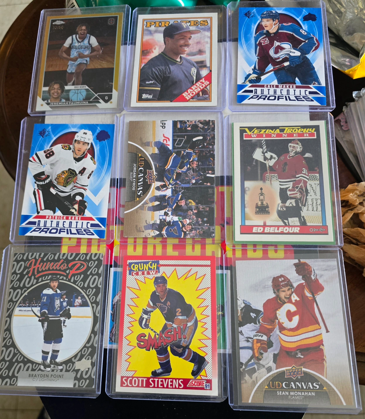 Large lot of hockey and baseball cards. Includes various players and brands like Upper Deck, Authentic Profiles, UD Canvas, and more. Some cards in protective cases. Great for collectors or hobbyists.