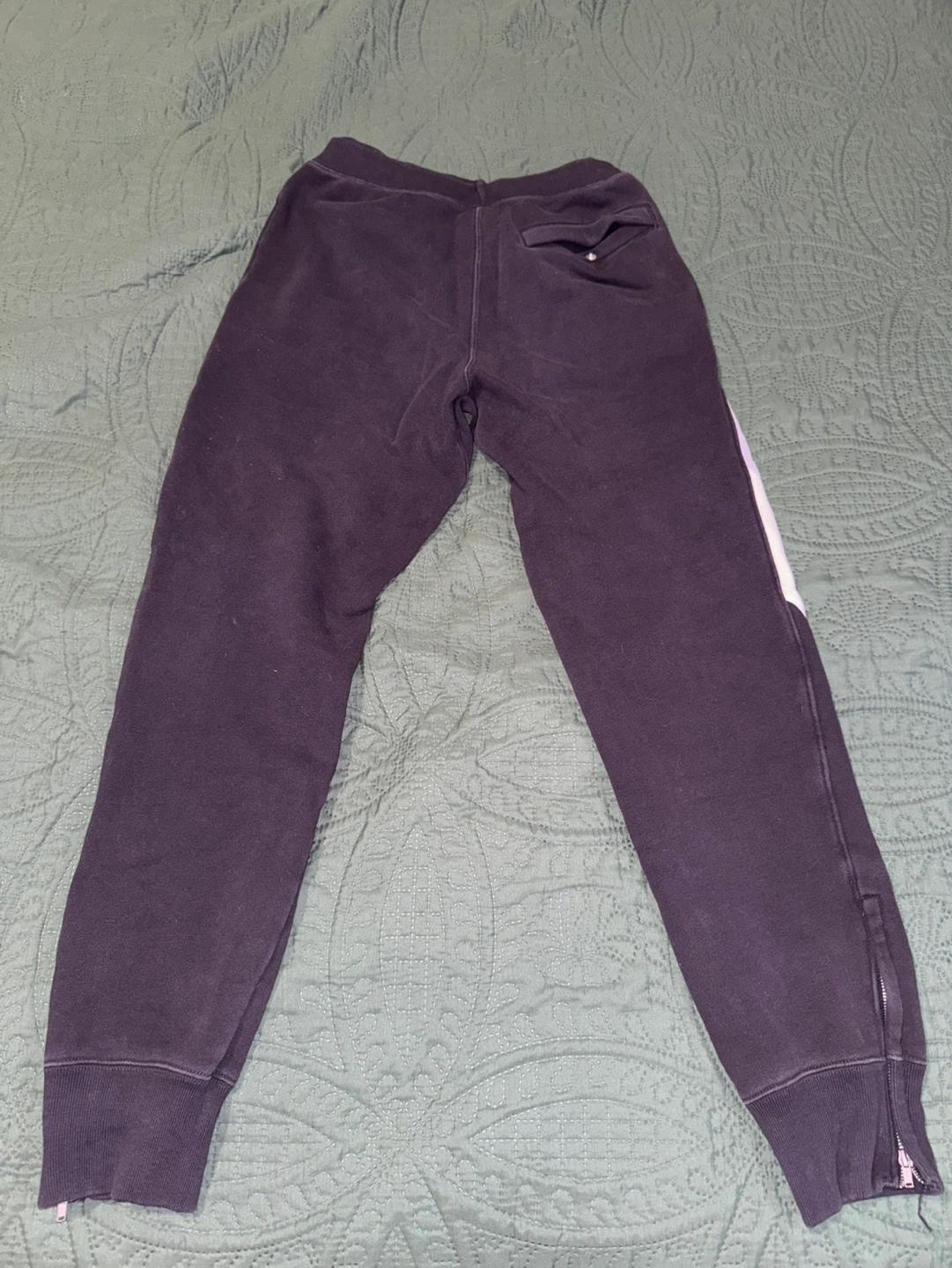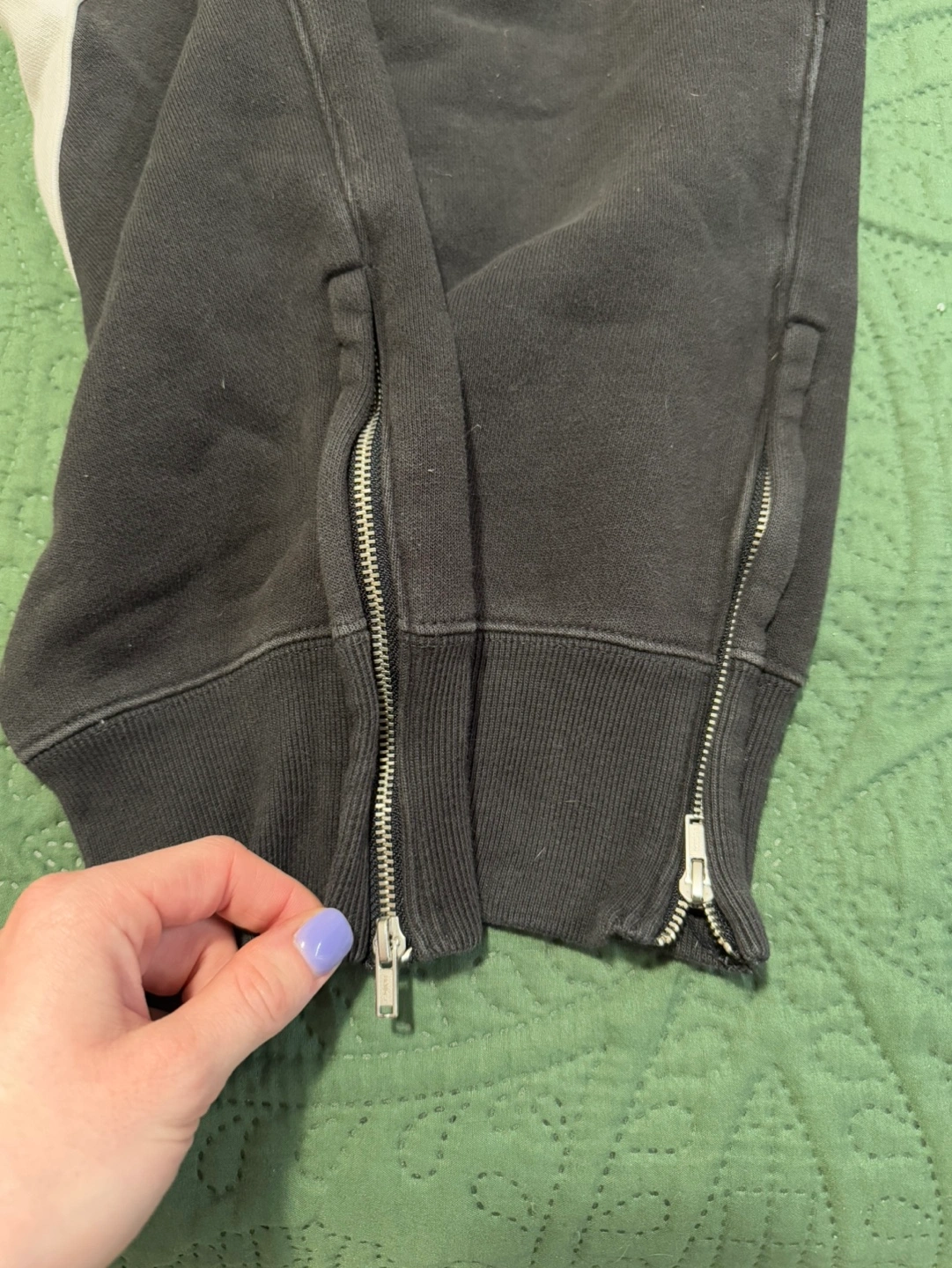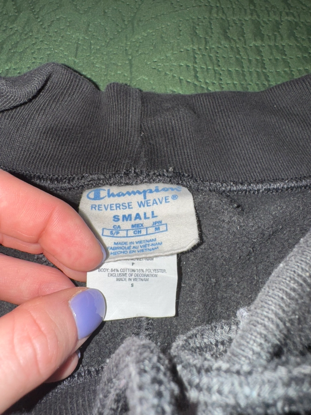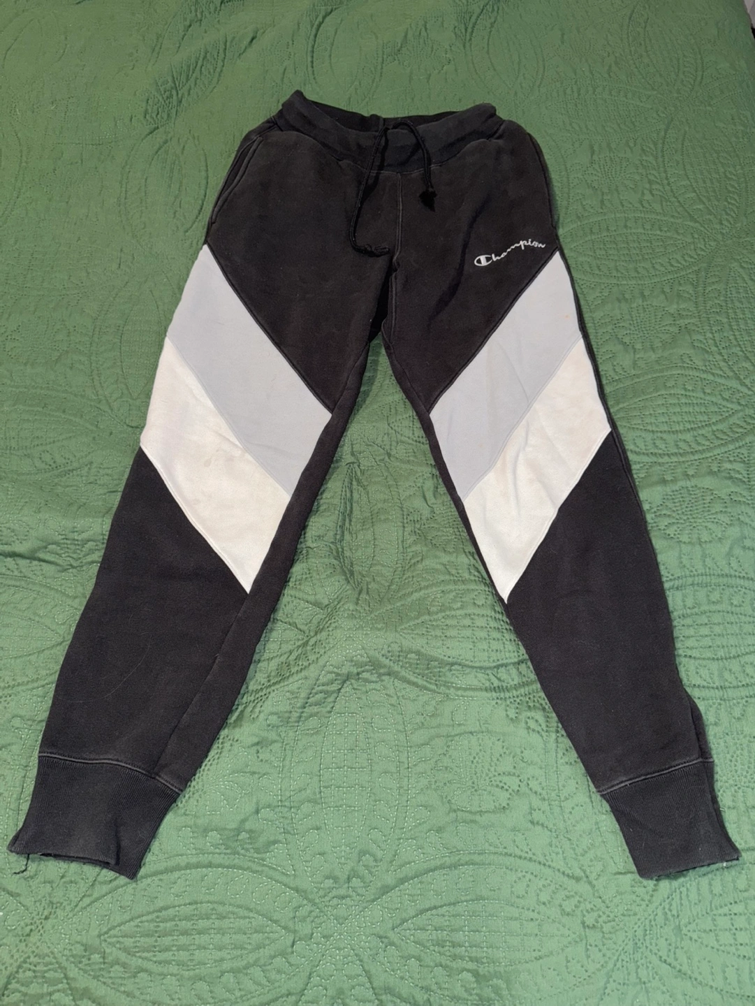 Black Champion Reverse Weave joggers. Size small. Colour block design with white and grey accents. Drawstring waistband and zippered ankles. Pre-owned, good condition, small stains on the strips as seen in picture.