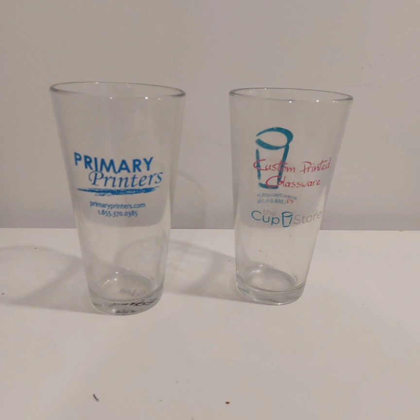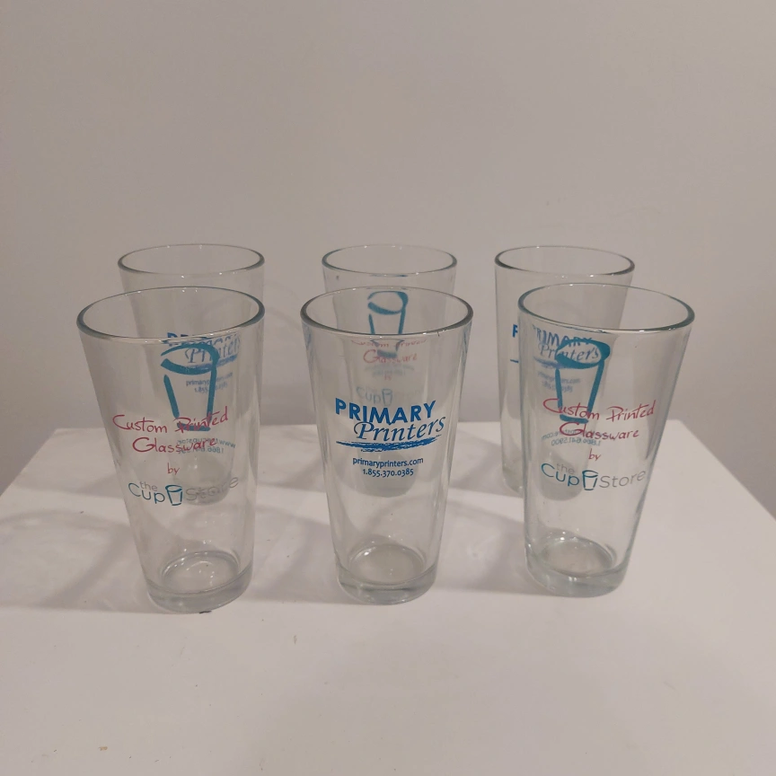 Set of six pint glasses. Some glasses feature Primary Printers logo and website, others The Cup Store logo. Custom printed glassware. Clear glass.